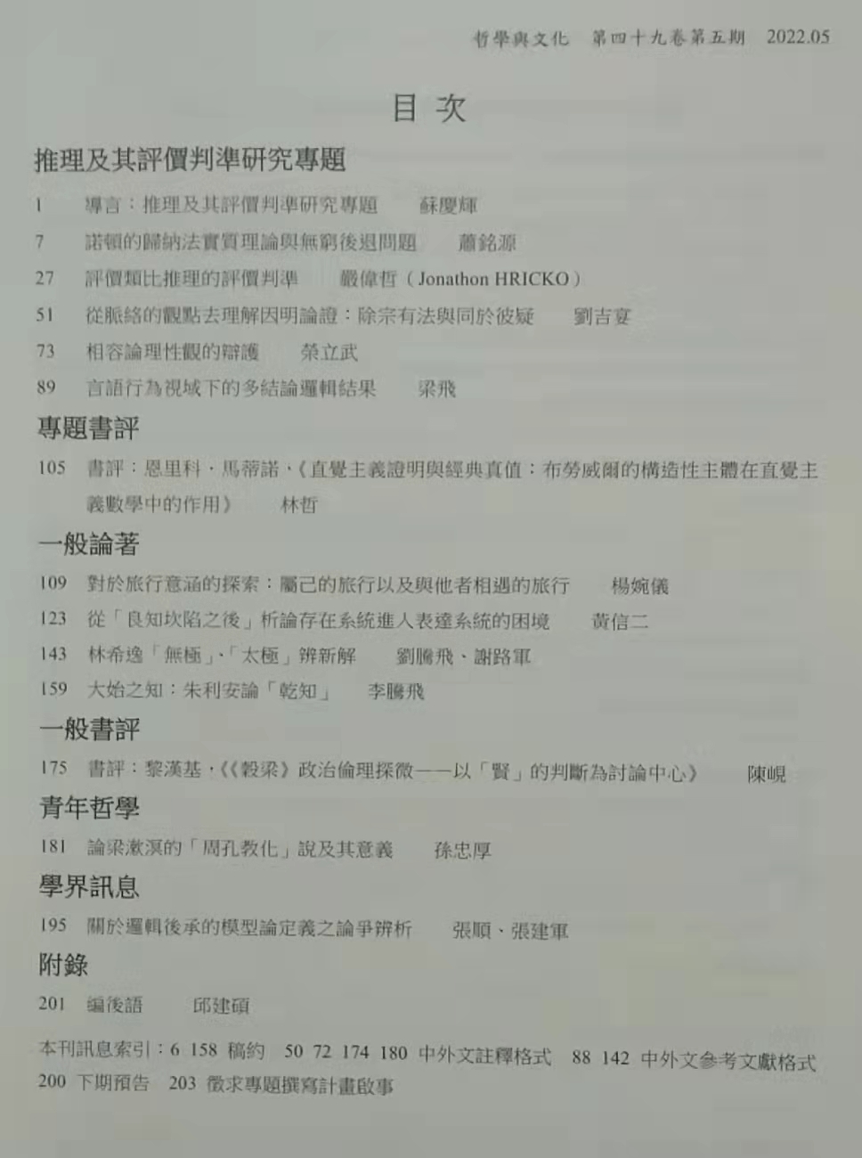 苏庆辉教授担任《哲学与文化月刊》专题主编,以“推理及其评价判准”为研究主题,出版5篇专题论文和1篇专题书评(见《哲学与文化月刊》2022年5月,总第576期),其中包括我院荣立武副教授为独立作者的“相容论理性观的辩护”和梁飞副研究员为独立作者的“言语行为视域下的多结论逻辑结果”两篇研究性文章,苏庆辉教授为专题撰写了导言。