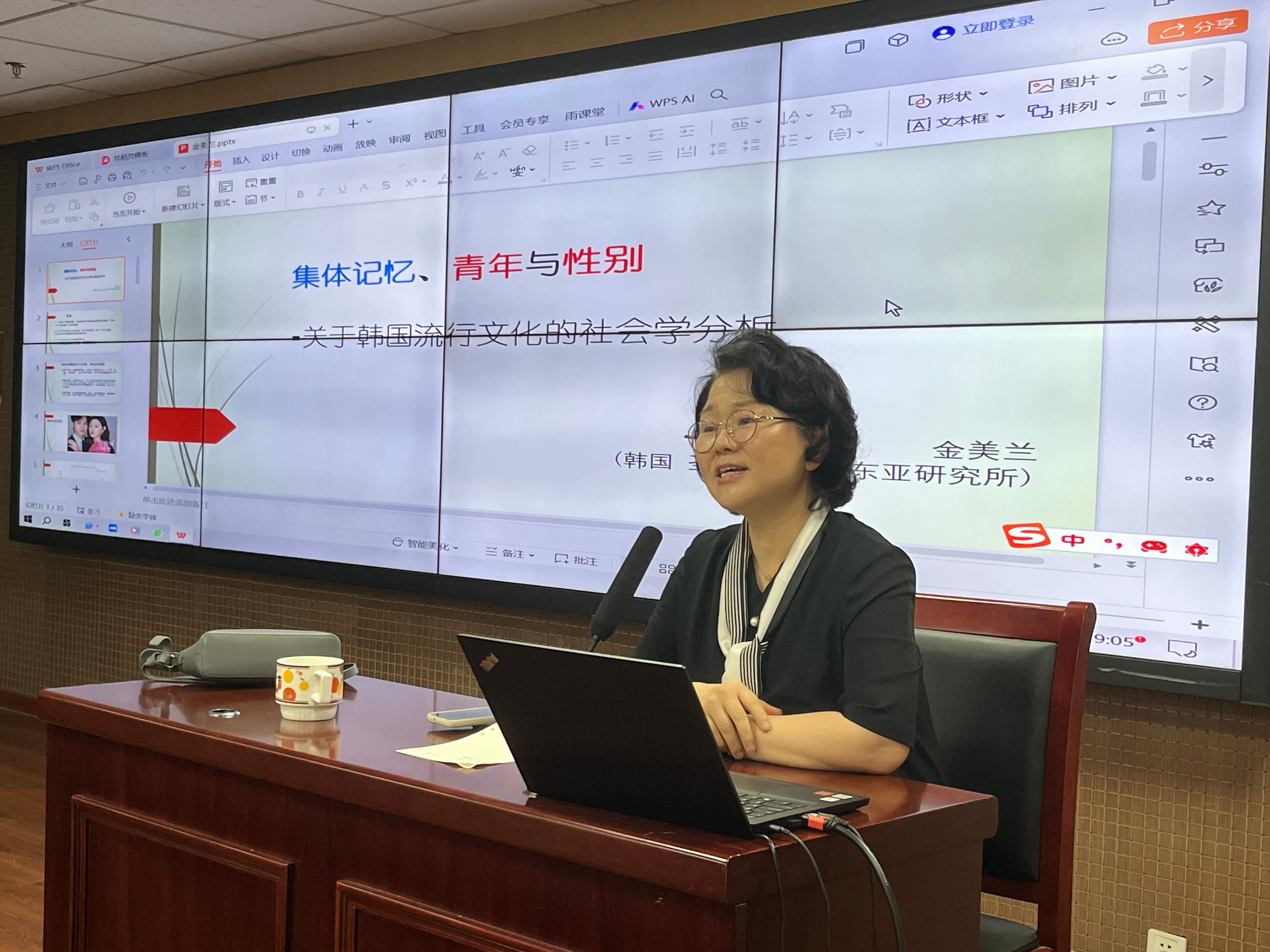 2024年5月10日晚,韩国圣公会大学教授、东亚文化与性别领域的知名学者金美兰应邀在山东大学成人在线免费视频进行了以“集体记忆、青年与性别:关于韩国文化的社会学分析”为主题的专题讲座,该学院社会学系教授王向贤予以主持。