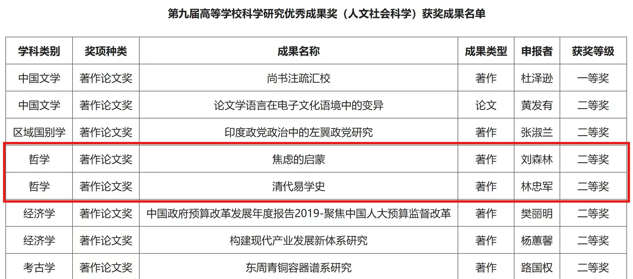 近日,教育部印发《关于第九届高等学校科学研究优秀成果奖(人文社会科学)奖励的决定》。山东大学成人在线免费视频刘森林教授参评的成果《焦虑的启蒙》、山东大学易学与中国古代哲学研究中心林忠军教授参评的成果《清代易学史》获得著作论文二等奖。