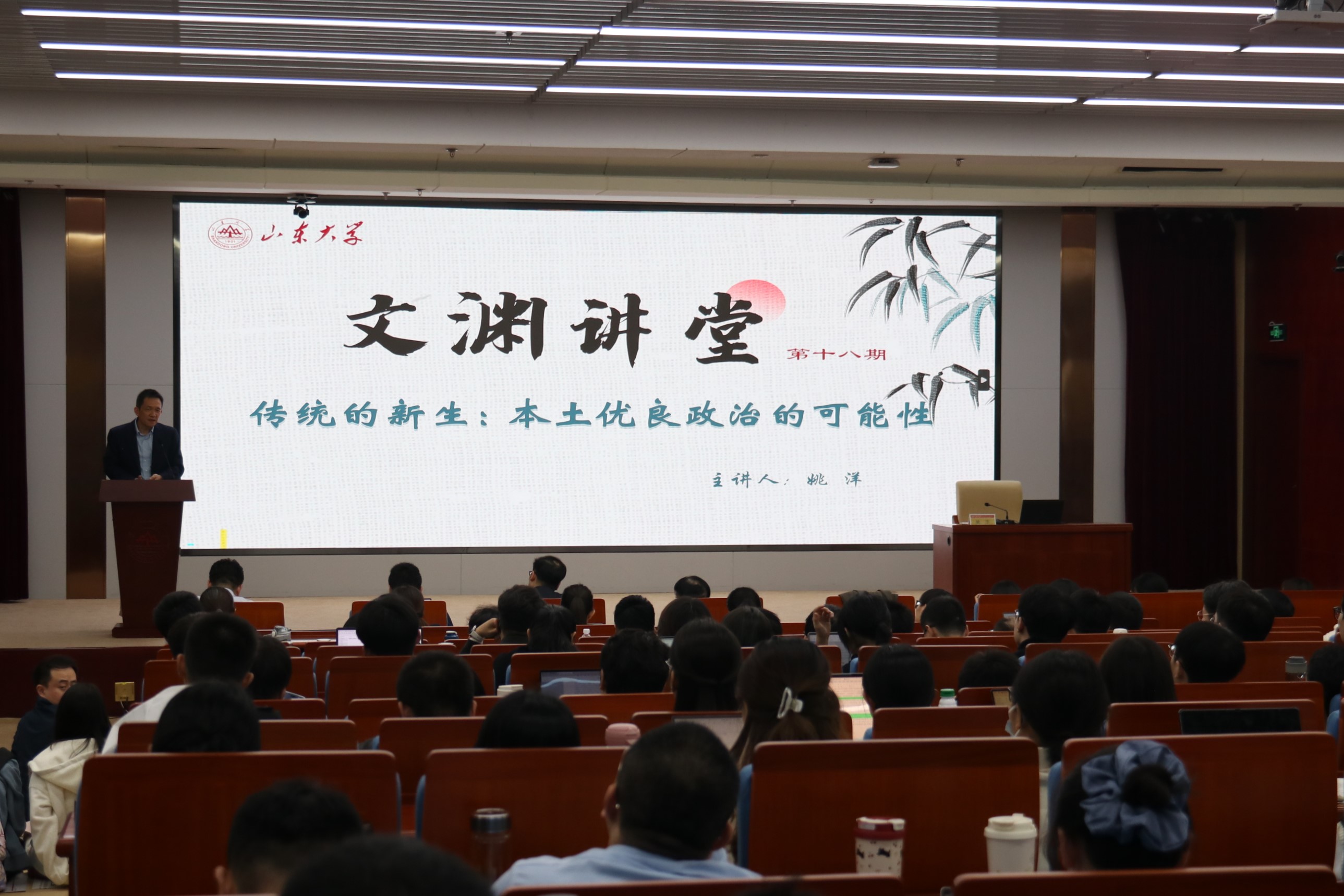 11月15日晚,著名经济学家、北京大学博雅特聘教授、中国经济研究中心主任姚洋做客山东大学“文渊讲堂”第十八期,作题为“传统的新生——本土优良政治的可能性”的学术讲座。山东大学人文社科研究院院长郑敬斌主持讲座。