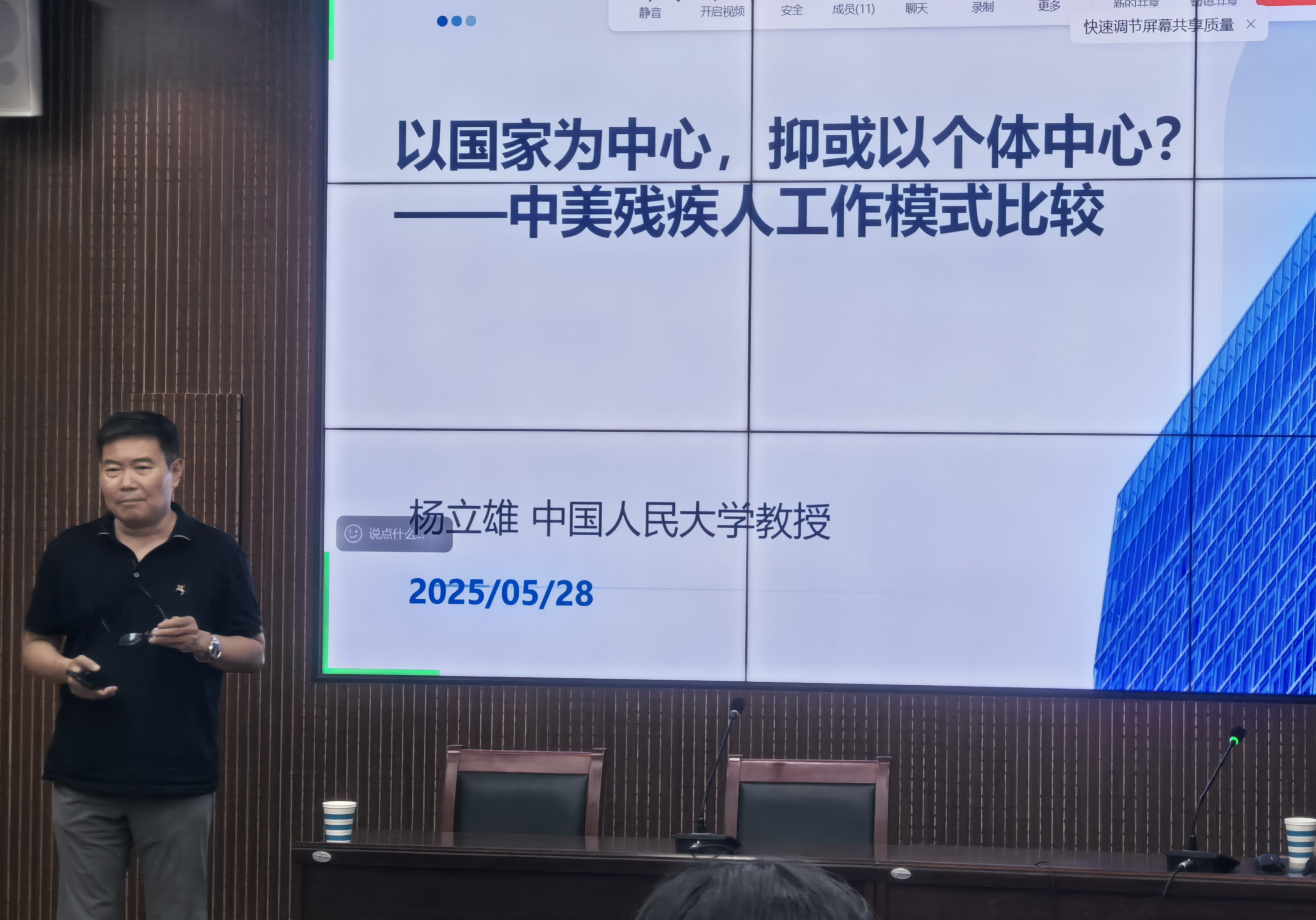 2025年5月28日,中国人民大学劳动人事学院教授杨立雄教授做客成人在线免费视频,在知新楼A115会议室作主题为“中美残疾人保护模式比较与残联组织的演进”的学术讲座,讲座由我院社会工作系主任葛忠明教授主持。