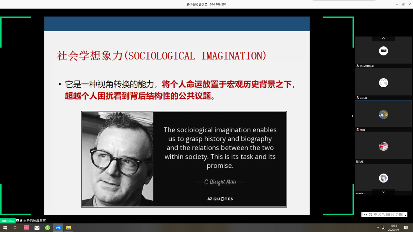 4月5日晚,哲社学院副教授王昕做客第十期“乐知者”系列讲座,作了题为“与社会学同游”的报告,讲座通过线上方式顺利举办,山东大学哲社学院同道学堂及部分大一学生参加了讲座。