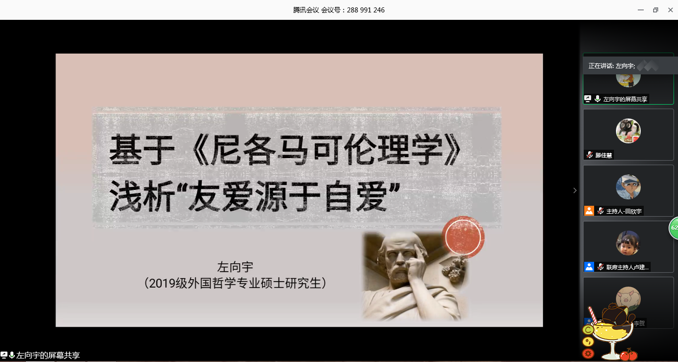 本次论坛入选论文主题涵盖哲学、社会学、社会工作、社会保障、宗教学等专业领域。迟艳艳同学作了题为《美国、瑞典长期护理制度的比较研究》的报告,比较了美国以市场为主导的自由主义福利体制和瑞典以国家为主导的社会民主主义福利体制;任玮琪同学作了题为《互联网与社会工作机构的资源动员:新型冠状病毒肺炎疫情中L机构的“临时转型”》的报告;左向宇同学从亚里士多德的“有爱”、“自爱”及其之间的关系出发作了题为《基于<尼各马可伦理学>浅析“友爱源于自爱”》的报告;贾丰竹同学作了题为《将重度残疾人纳入长期护理保险制度——基于15个首批试点城市的对比分析》的报告,指出重度残疾人纳入长期护理保险制度的过程存在许多障碍,并为此提出了自己的建议;刘韫祺同学作了题为《“可行能力”视角下伤残农民工生存困境及对策研究》的报告;马芳同学作了题为《社会工作介入罕见病儿童教育虚拟社区的路径探索》,提出了两条相互配合的路径;任学慧同学作了题为《义务教育阶段的关系就学——基于中国家庭追踪调查2016年第三轮追踪调查数据》,分析了何种阶层的家庭更有可能使用关系这种社会资本进行就学;张伟同学作了题为《弘扬儒家思想的优越性》,认为中国文化在理性精神的教化以及对自然的敬畏方面为社会的发展提供了方向。