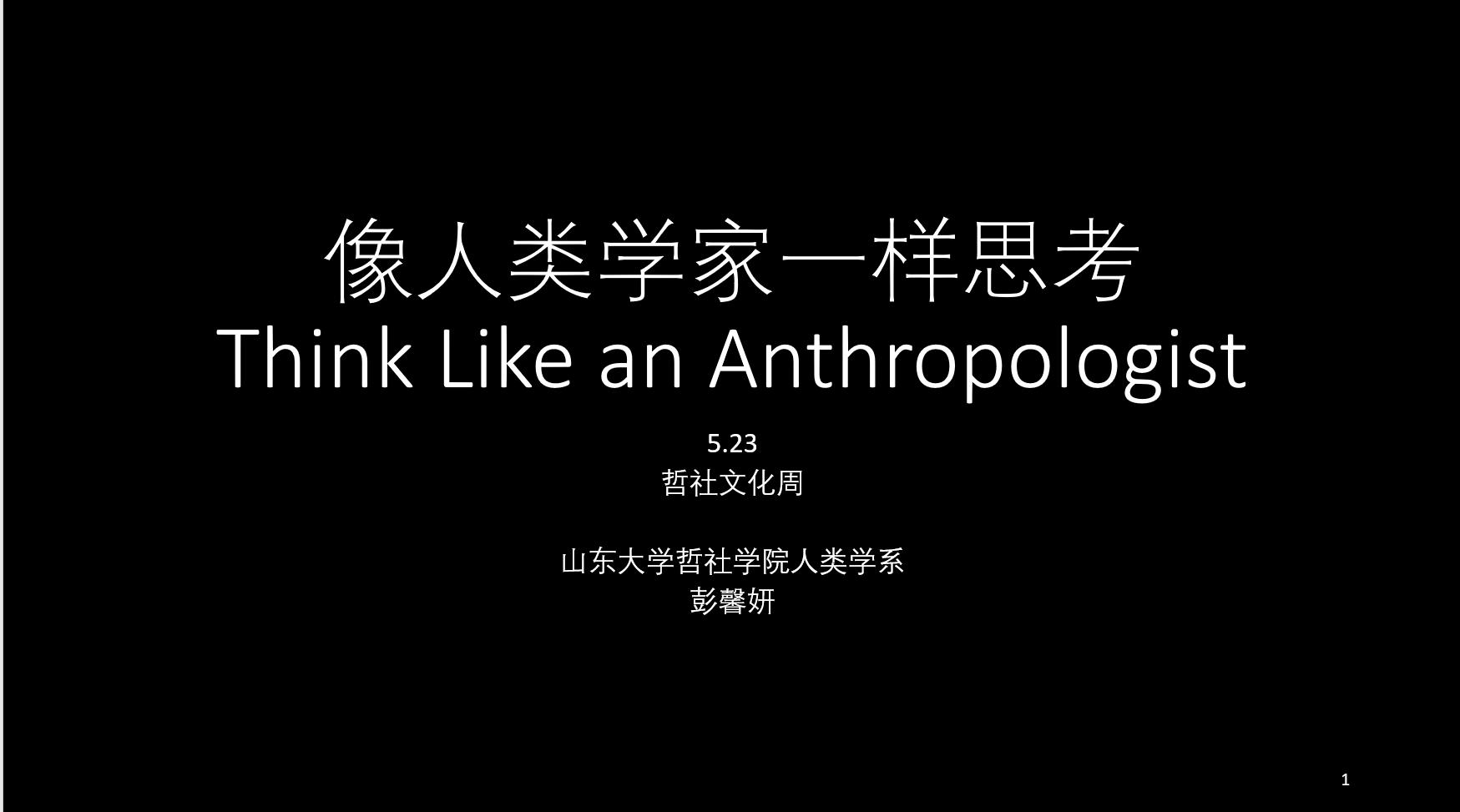 5月23日晚,“哲社文化周”系列讲座正式拉开帷幕。在第一场讲座,我们非常荣幸邀请到人类学系助理研究员彭馨妍。她为同学们带来了一场名为“像人类学家一样思考(Think Like anAnthropologist)”的精彩报告。本次讲座采用线上直播的方式顺利进行,山东大学各个学院的同学以及部分外校人士参加了此次讲座,并就其内容进行了踊跃提问与探讨。