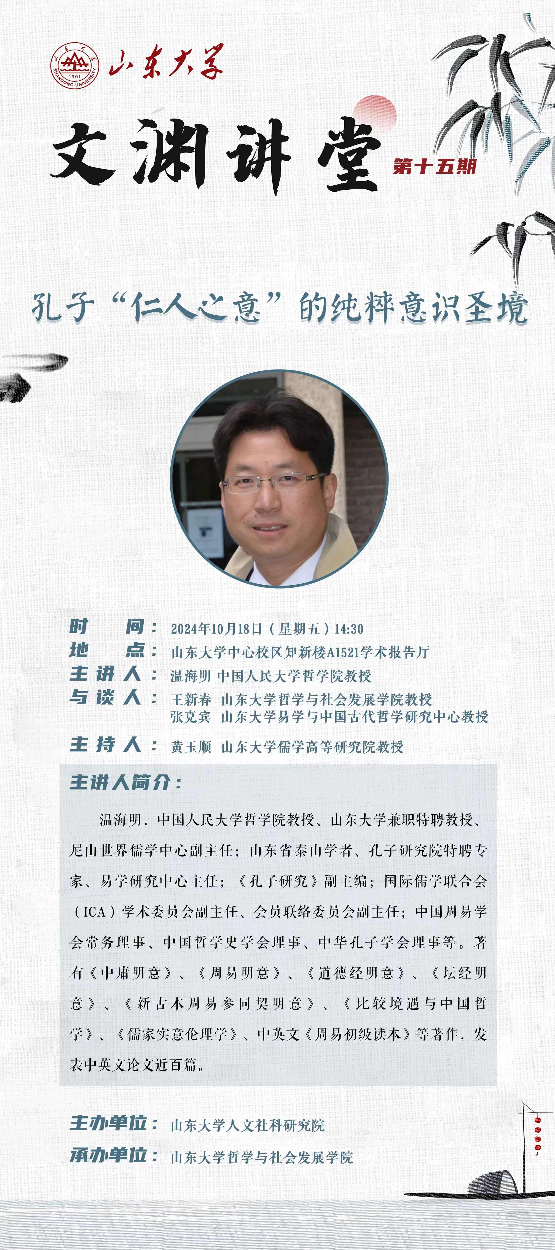 温海明,中国人民大学哲学院教授、山东大学兼职特聘教授、尼山世界儒学中心副主任;山东省泰山学者、孔子研究院特聘专家、易学研究中心主任;《孔子研究》副主编;国际学联合会(ICA)学术委员会副主任、会员联络委员会副主任;中国周易学会常务理事、中国哲学史学会理事、中华孔子学会理事等。著有《中庸明意》、《周易明意》、《道德经明意》、《坛经明意》、《新古本周易参同契明意》、《比较境遇与中国哲学》、《儒家实意伦理学》、中英文《周易初级读本》等著作,发表中英文论文近百篇。