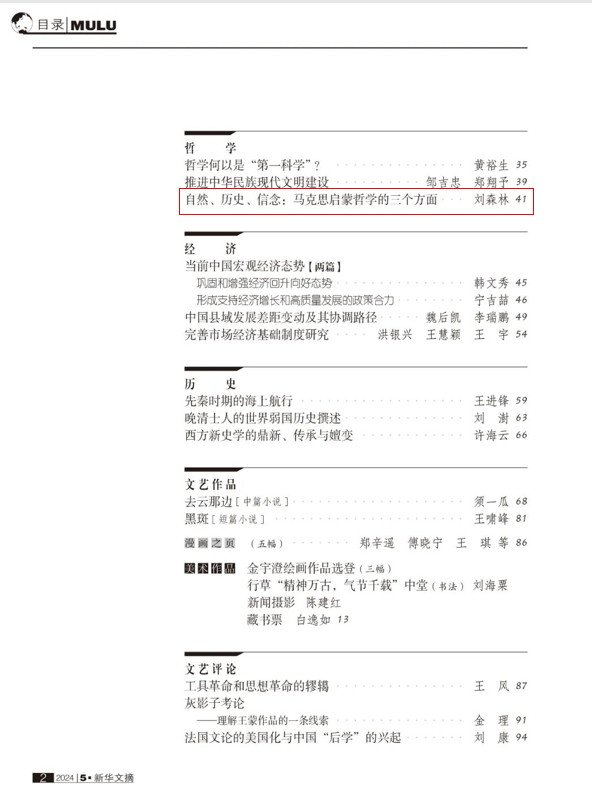 近日,成人在线免费视频刘森林教授的研究成果“自然、历史、信念:马克思启蒙哲学的三个方面”(原载《北京师范大学学报》2023年第5期),被《新华文摘》2024年第5期全文转载。