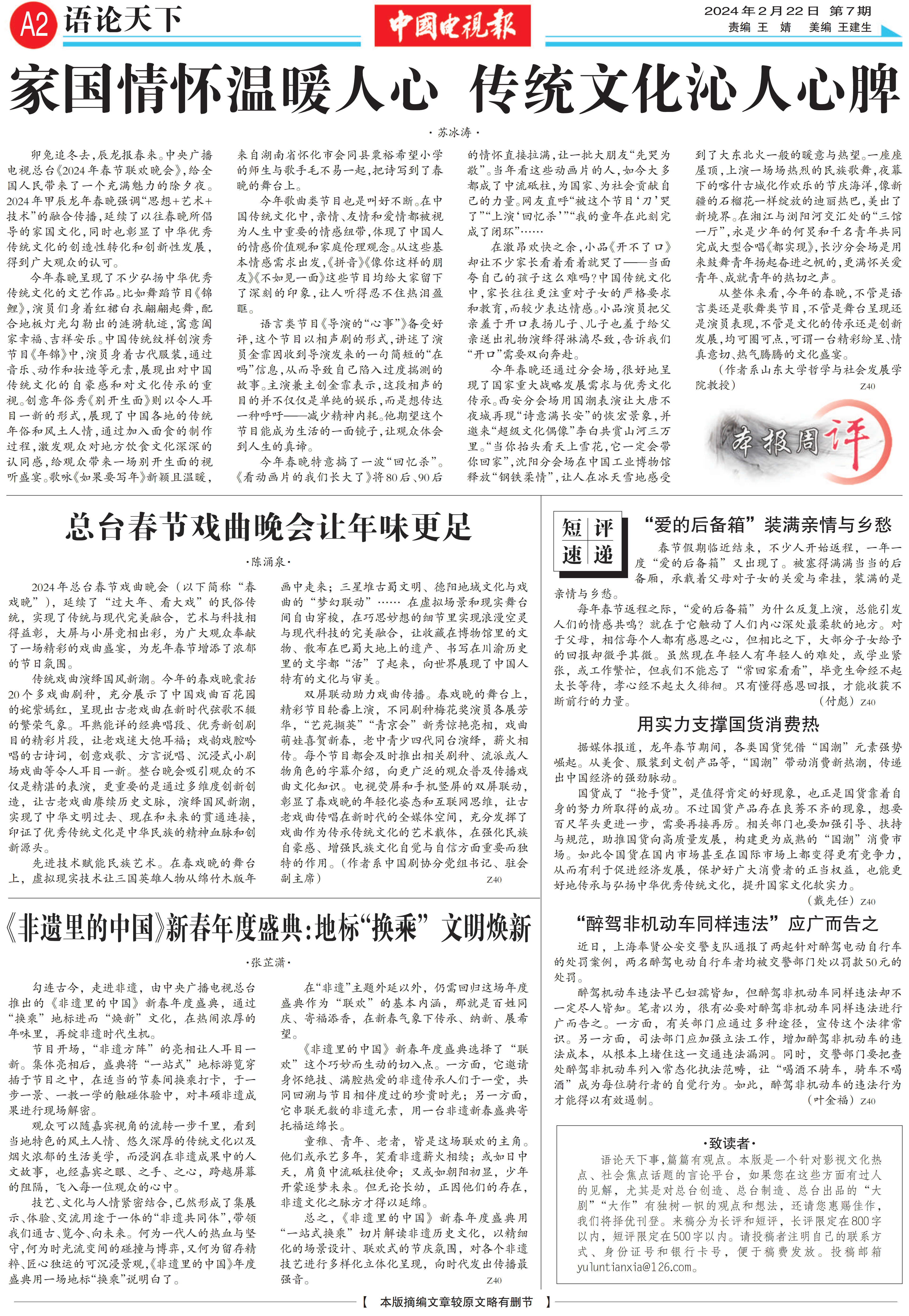 文章认为,2024年甲辰龙年春晚是一场既延续以往春晚所倡导的家国文化,又彰显中华优秀传统文化的创造性转化和创新性发展,强调“思想+艺术+技术”融合传播的文化盛宴。文中提到,今年春晚呈现了不少弘扬中华优秀传统文化的文艺作品、体现中国人的情感价值观和家庭伦理观念的歌曲类节目、传达正向呼吁和真谛的语言类节目等等。此外,今年春晚还通过分会场,生动地呈现了国家重大战略发展需求与优秀文化传承,将历史的厚重与时代的光华集于一身。整体而言,今年的春晚可谓是一台精彩纷呈、情真意切、热气腾腾的文化盛宴。