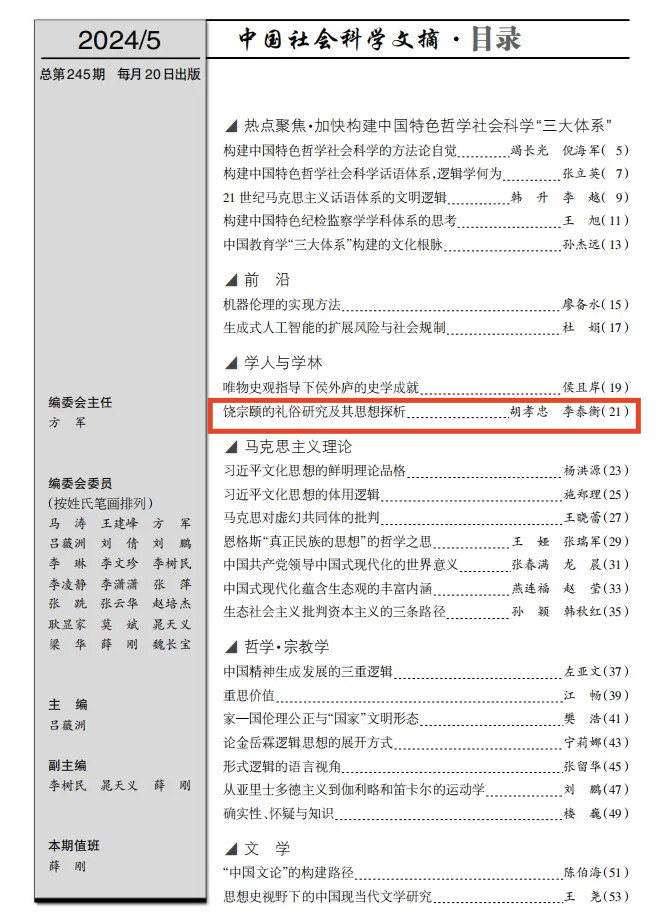 近日,山东大学犹太教与跨宗教研究中心、成人在线免费视频胡孝忠副教授与复旦大学博士研究生李泰衡共同在CSSCI来源期刊《民俗研究》2024年2期发表的论文《饶宗颐的礼俗研究及其思想探析》被《中国社会科学文摘》2024年第5期转载、推介。