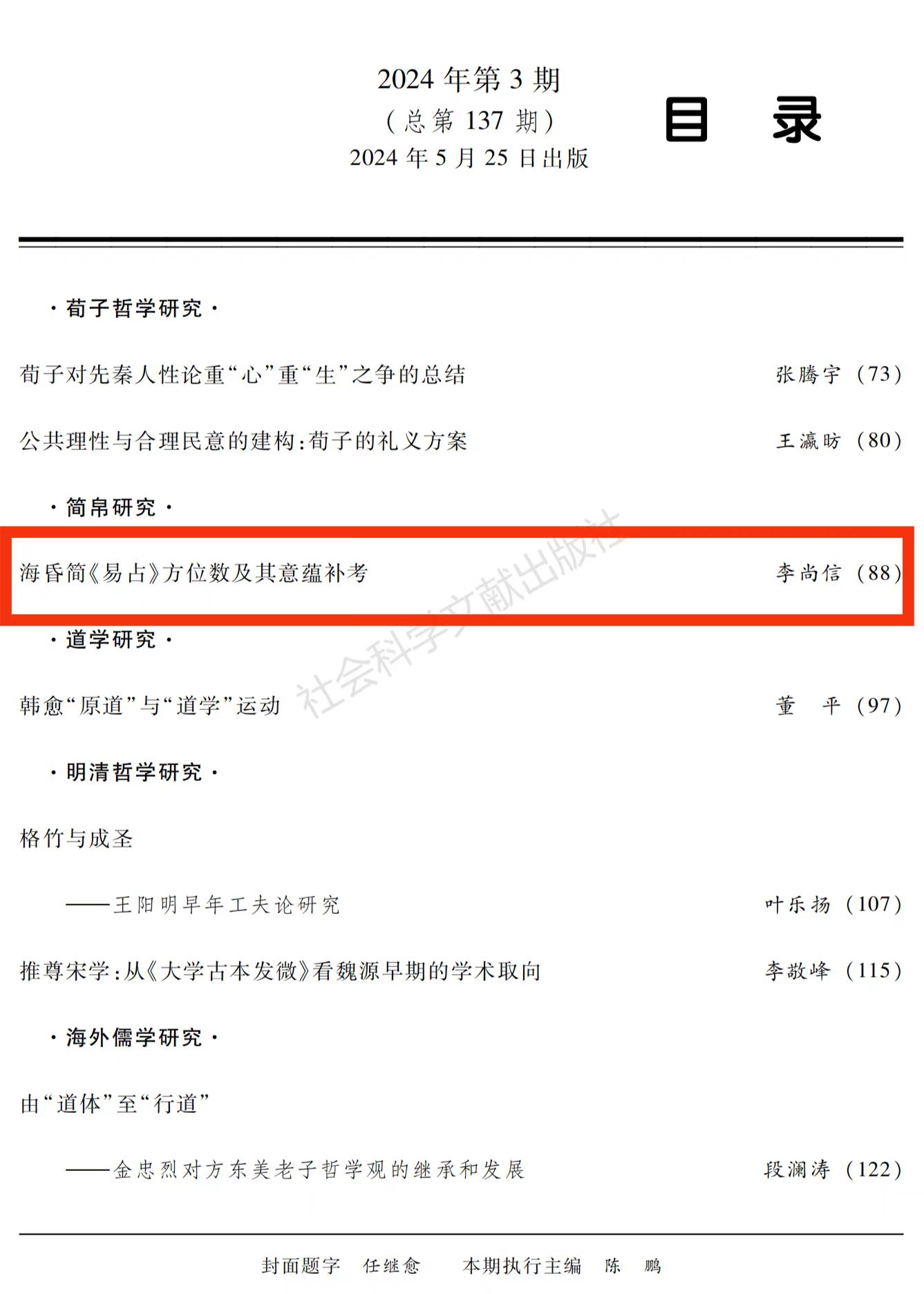 近日,山东大学易学与中国古代哲学研究中心李尚信教授在《中国哲学史》2024年第3期上发表了题为《海昏简<易占>方位数及其意蕴补考》的高质量论文。