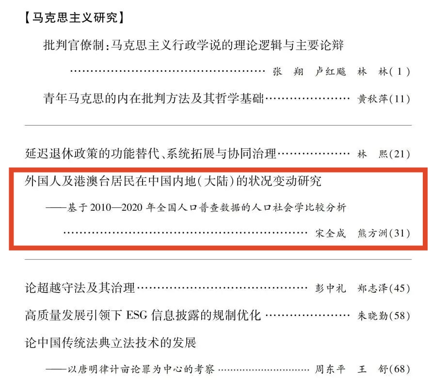 近日,山东大学成人在线免费视频宋全成教授与其硕士研究生熊方洲共同在《厦门大学学报(哲学社会科学版)》 2024年第3期上发表了题为《外国人及港澳台居民在中国内地(大陆)状况变动研究——基于2010—2020年全国人口普查数据的人口社会学比较分析》的高质量论文。