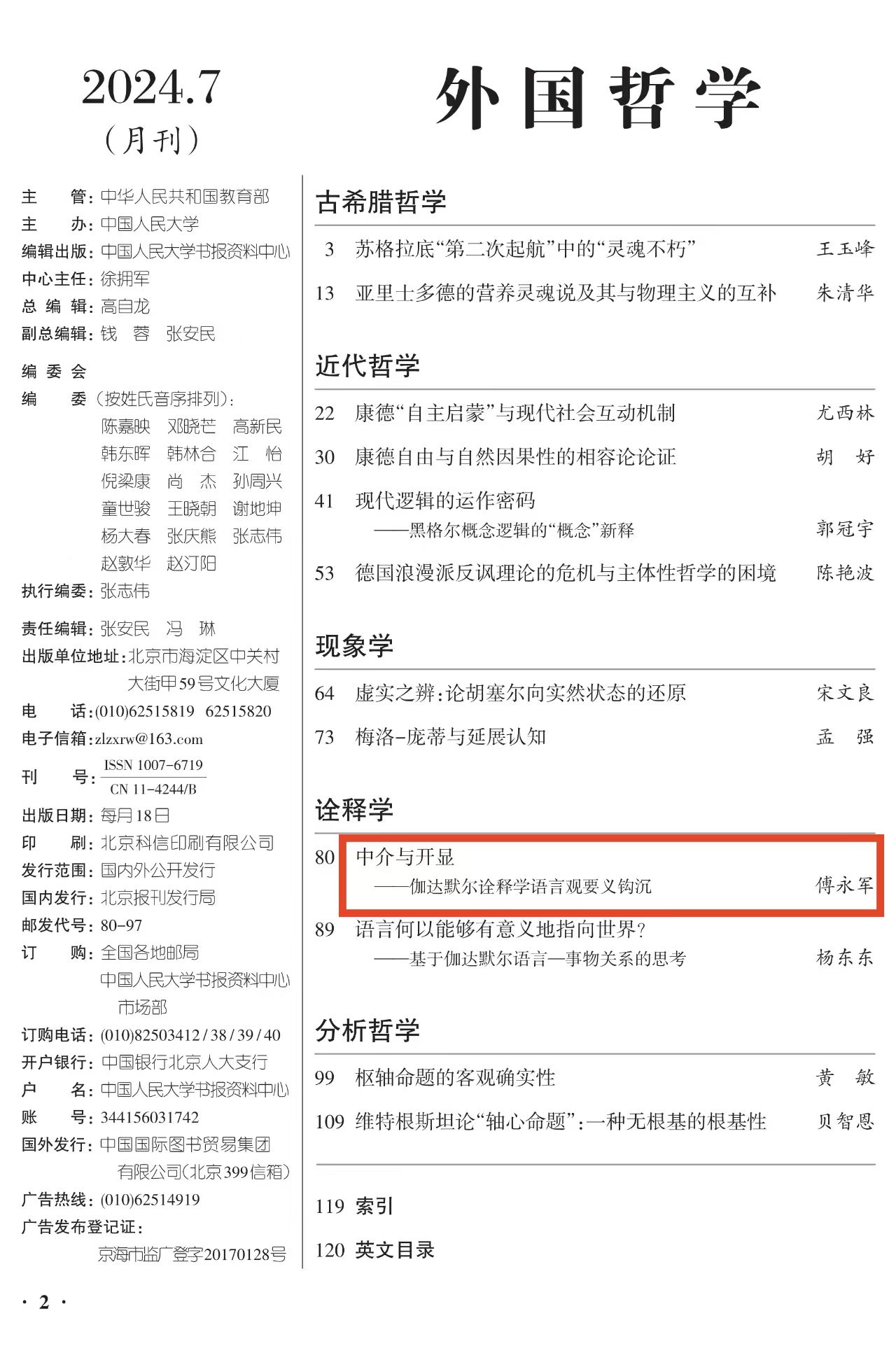 近日,人大复印资料《外国哲学》2024年第7期全文转载了山东大学成人在线免费视频傅永军教授的题为《中介与开显——伽达默尔诠释学语言观要义钩沉》的高质量论文。