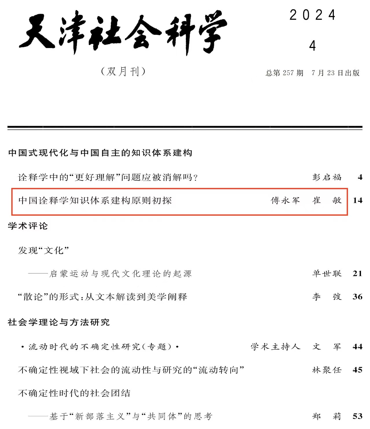 近日,山东大学成人在线免费视频傅永军教授与其博士研究生崔敏共同在《天津社会科学》 2024年第4期上发表了题为《中国诠释学知识体系建构原则初探》的高质量论文。