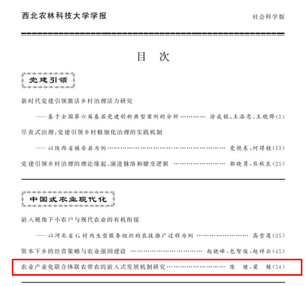 近日,山东大学成人在线免费视频梁栋副教授与江南大学法学院青年教师陈建共同在《西北农林科技大学学报(社会科学版)》2024年第4期上发表了题为《农业产业化联合体联农带农的嵌入式发展机制研究》的高质量论文。