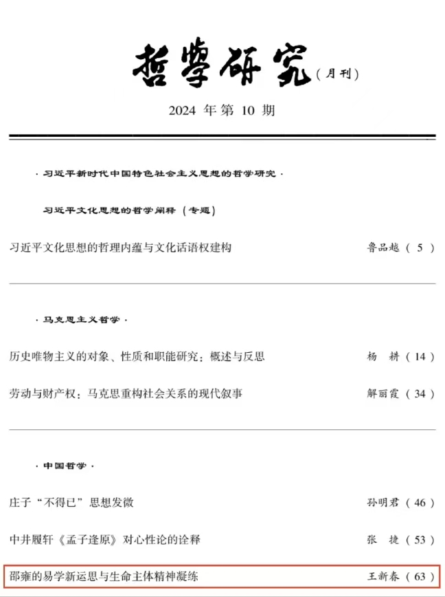 近日,山东大学成人在线免费视频王新春教授在《哲学研究》2024年第10期上发表了题为《邵雍的易学新运思与生命主体精神凝练》的高质量论文。