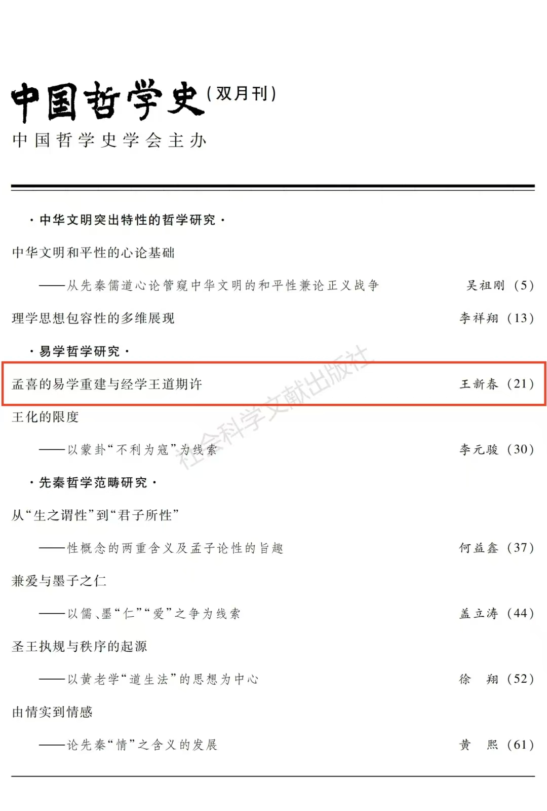 近日,山东大学成人在线免费视频王新春教授在《中国哲学史》2024年第6期上发表了题为《孟喜的易学重建与经学王道期许》的高质量论文。