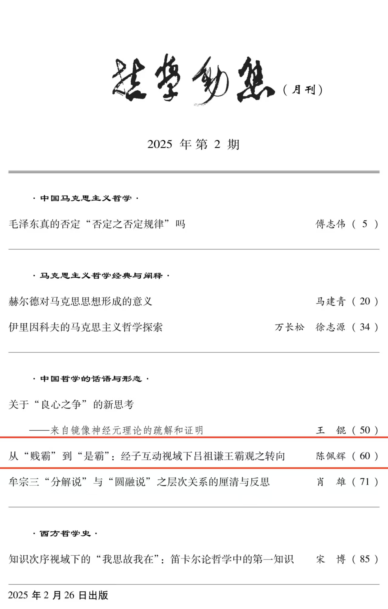 近日,山东大学成人在线免费视频暨易学与中国古代哲学研究中心副研究员陈佩辉在《哲学动态》2025年第2期上发表了题为《从“贱霸”到“是霸”:经子互动视域下吕祖谦王霸观之转向》的高质量论文。