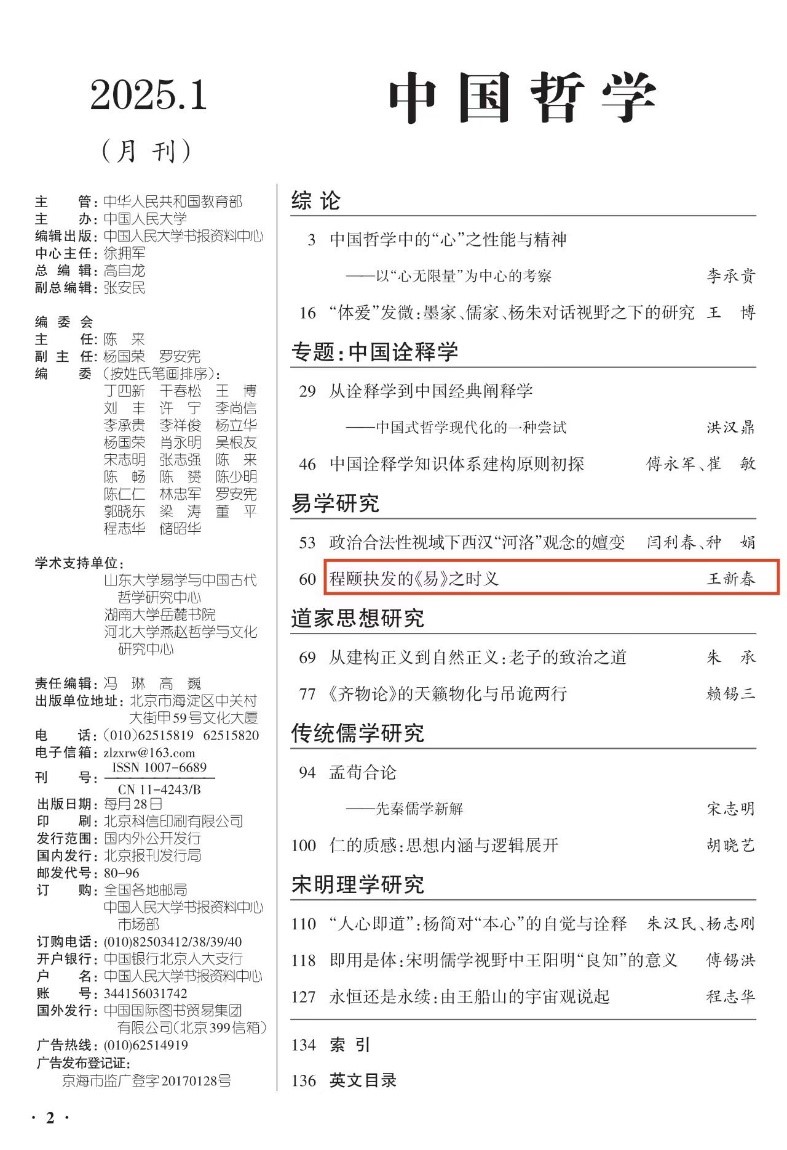 近日,人大复印资料《中国哲学》2025年第1期全文转载了成人在线免费视频王新春教授的题为《程颐抉发的<易>之时义》的高质量论文,该文原载 于《周易研究》2024年第5期。