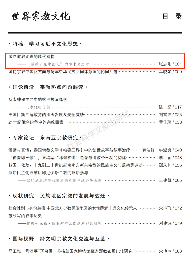 近日,山东大学成人在线免费视频暨犹太教与跨宗教研究中心张志刚教授在《世界宗教文化》2025年第1期上发表了题为《试论道教义理的现代建构——“道教研究中国化”的学术史思考》的高质量论文。