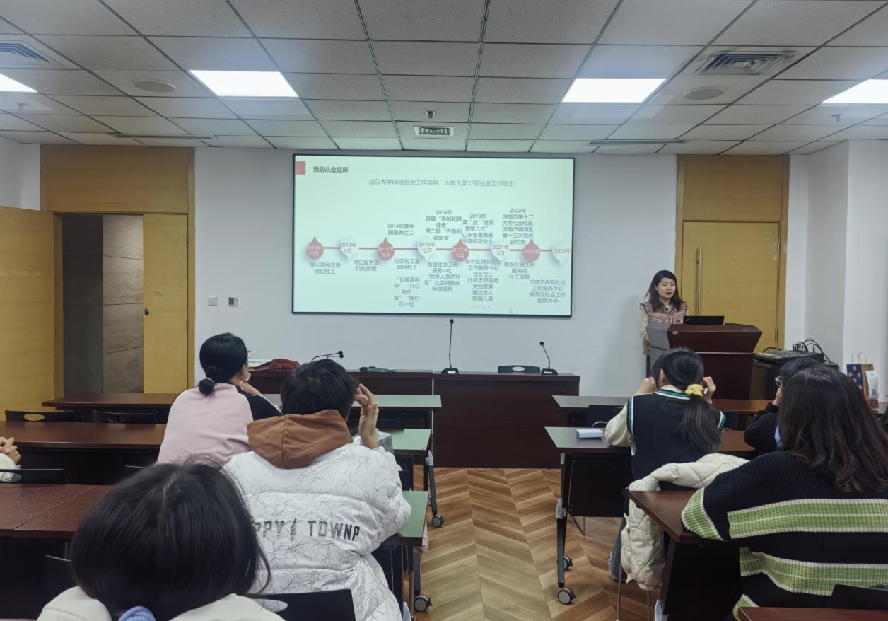 本次经验分享会由哲社学院团委主办、哲社学院学生科学技术协会协办,特邀拥有13年实务服务经历并荣获2014年度“中国最美社工”荣誉的山大校友张海丽女士前来分享。