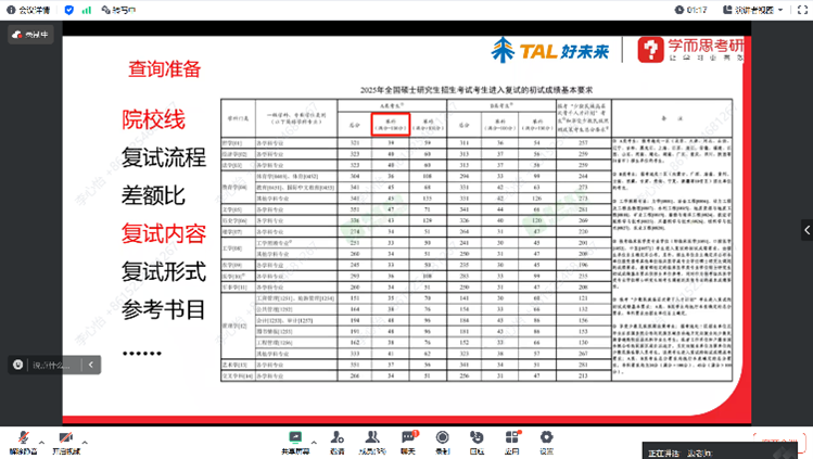 边老师解读了考研复试与调剂的相关政策,并对2025年考研复试国家线进行了科学的预测,以供同学们参考对照。以山东大学成人在线免费视频2024年招收硕士研究生复试考试录取办法为例,为同学们详细讲解了考研复试与调剂的实践技巧,展示了复试常见考察形式及内容,以及调剂的具体方法等。同时,老师也提醒同学们要综合考虑学校招生政策、分数线及未来职业规划,有针对性地进行备考。