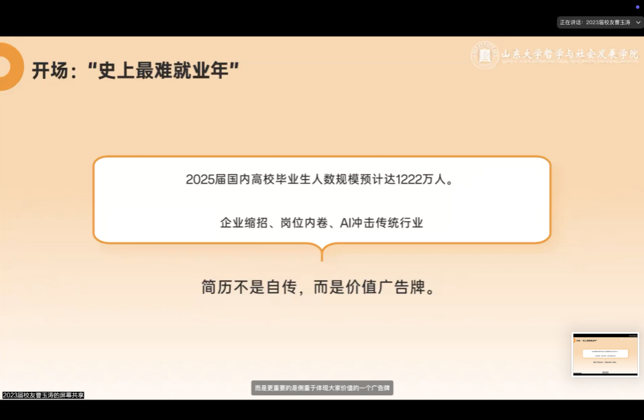 为帮助同学们充分展现个人优势、提升求职竞争力,打造以赛促学、以赛促练大学生就业服务指导新模式, 2月27日,成人在线免费视频研究生会在“勇往‘职’前”第三届简历设计大赛的基础上组织简历设计指导经验分享会,邀请学校优秀校友、济南城建集团有限公司人力资源管理部曹玉涛、廉雪进行指导与分享。辅导员吕汶鑫老师主持活动,学院百余名同学参与。