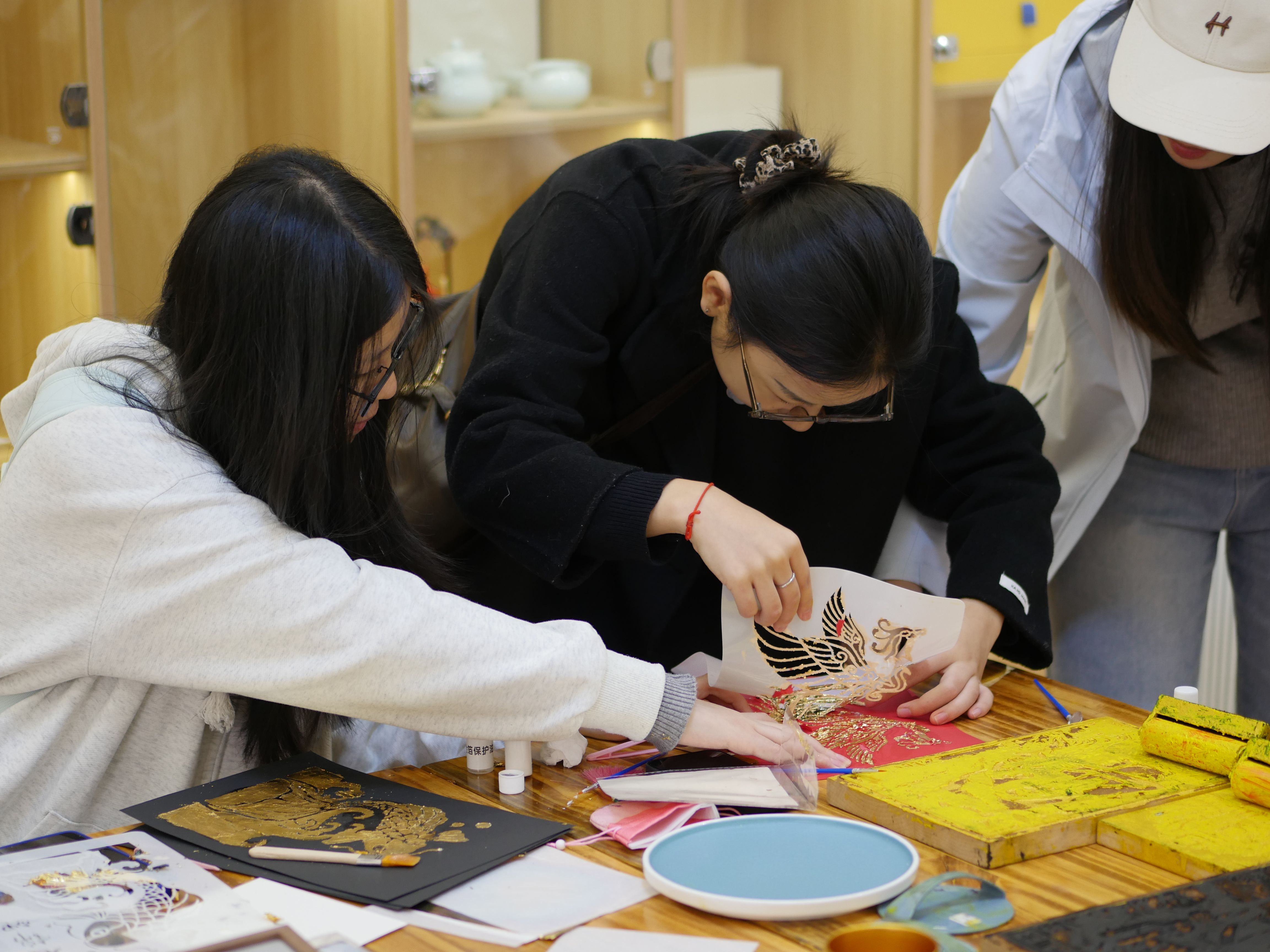 在非遗手作体验环节,同学们系统学习了金箔画、书法相框、中草药香囊、漆扇和活字印刷等技艺的基础知识,在方寸金箔上勾勒山水意境,于宣纸墨香中装帧书法作品,在素白扇面上挥彩描绘春意盎然,体验活字排版中的汉字智慧,感受草药香囊调配中的古方匠心。在沉浸式创作中,成员们不仅领略了传统工艺的深厚魅力,更深刻体会到非遗文化“守正创新”的蓬勃生命力。
