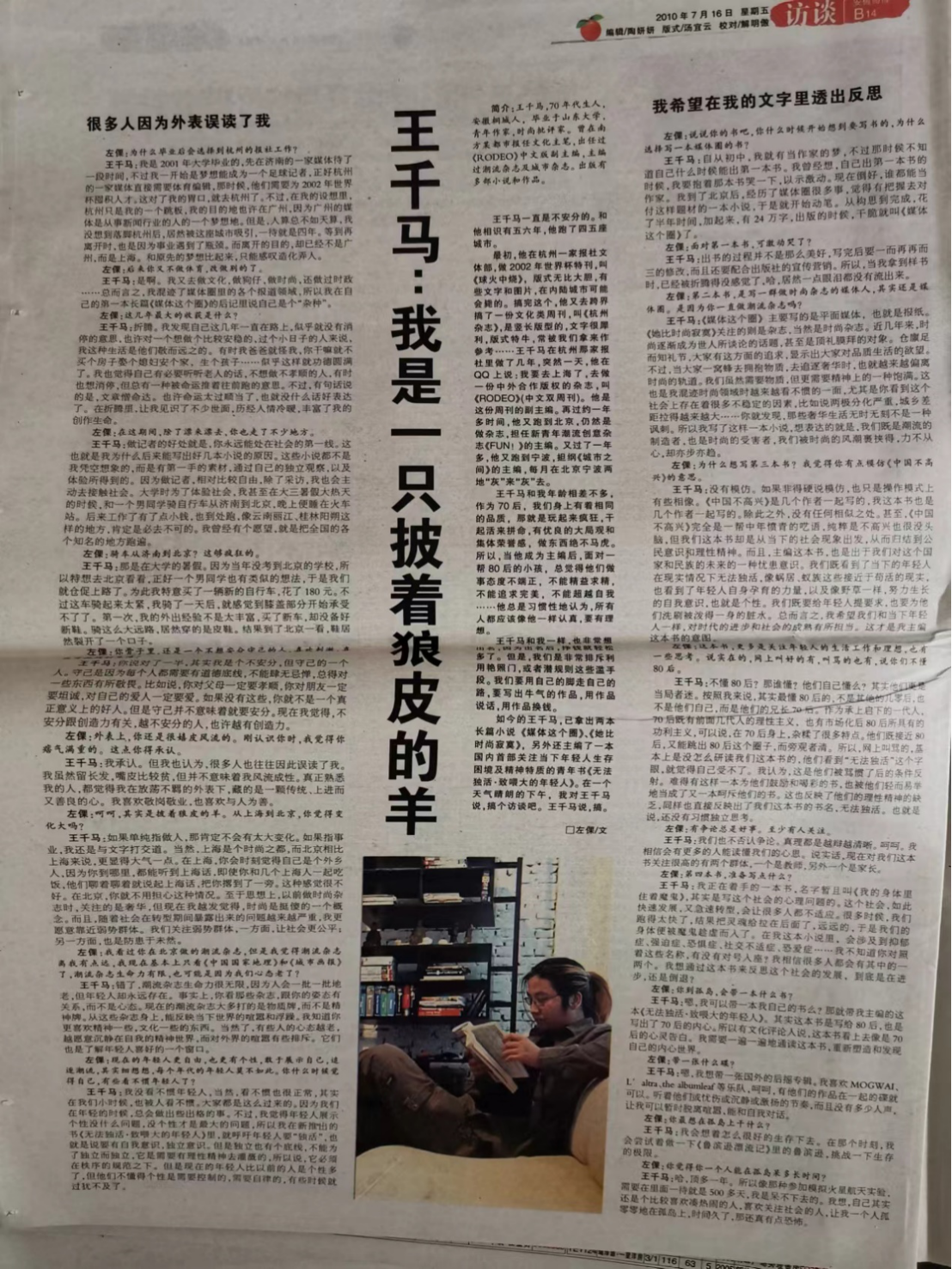 在学校求读期间,王千马深为母校文史哲的根基所折服,他回忆道,那时他只关心“文”,却没想到,“文史哲”这三个字像个预言,告知他要从事好文字工作,需要打通三者。如今从事中国商业地理研究,他更是悟到,没有好的史学和哲学基础,任你有如椽大笔,也写不出深度文章。回想青葱岁月,他很感谢有无数名师诲人不倦,也感谢有学校和文院诸座图书室——那些丰沛的藏书如春雨一样滋润心田。与此同时,王千马也在不懈地尝试创作,他回忆在《齐鲁晚报》刊发的文字,“尽管只是几句话,还是边条,而且署名‘徽人’,但它却是我第一次见到自己的文字变成了铅印”。这些文字变成阶梯,鼓舞和训练了他,让他对文字一步步更有感觉。