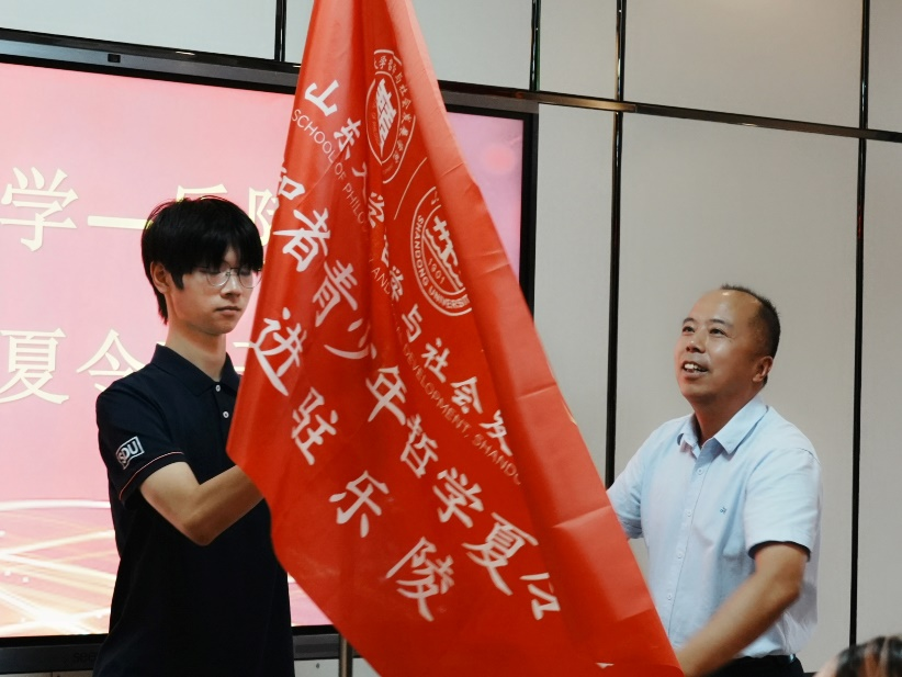 丁红春书记向乐智者乐陵实践团队授旗,标志着哲社学院示范性学生社会实践项目——乐智者哲学夏令营正式启动。