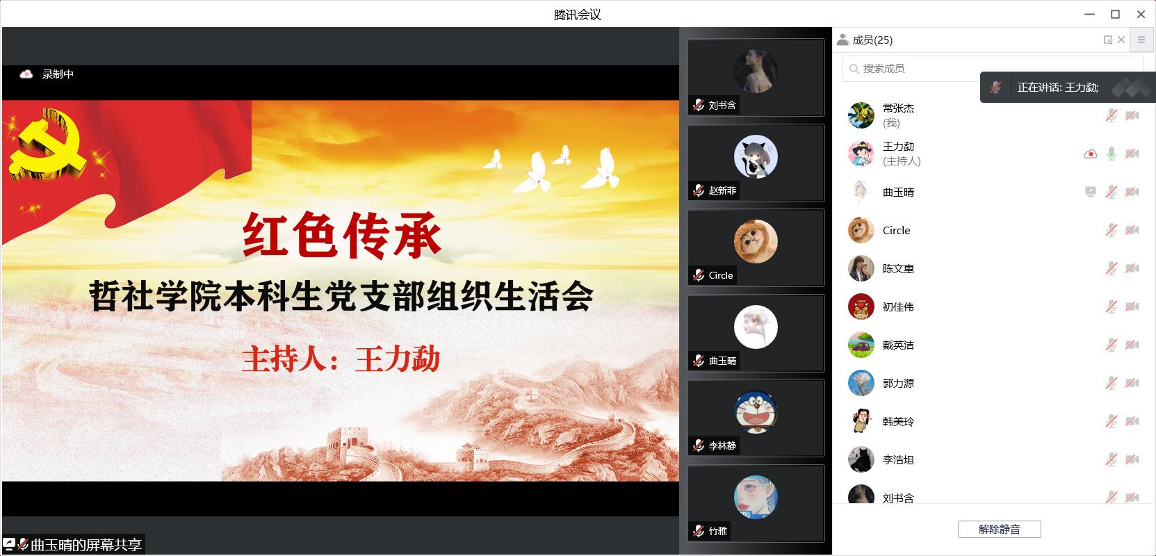 王力勐同志主持了组织会。交流环节,与会青年党员们结合个人经历展开热烈讨论,分享了自己在阅读、学习党史中的感想和见解。刘书含、陈文惠、初佳伟同志认为,历史是始终贯穿于发展之中的,要学好党的历史,知古鉴今,忆苦思甜,要从革命前辈的手里接过历史的接力棒,结合学生党员的本职工作,要从学习和思想上不断创新、不断发展,干好本职,提高素养。曲玉晴、吴宇新、吕奕涵同志谈到,中国共产党的成就,源自对人民的依靠;共产主义信仰,源自对人性的信心;中国共产党追求向上,具有无穷创造能力;追求向善,追求心灵和社会的美好。郭力源同志谈及了“历史主动精神”这一重要概念,中国共产党是掌握历史主动精神和历史创造精神的根本依靠,只有中国共产党才能最直接、最广泛、最有效地团结带领中国人民朝着民族复兴的中国梦奋勇前进。王胥博、时之鑫、李浩坦同志谈到,要明确目标,树立远大理想;坚持信念,勇于攻坚克难;乐于奉献,具备团队精神。