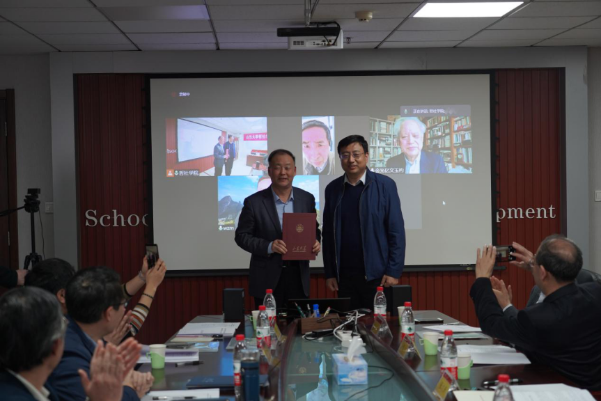 邢占军、刘森林分别代表学校、学院,向在现场参会的委员代表张文新教授颁发了山东大学兼职讲席教授聘任证书和战略咨询委员会聘书。