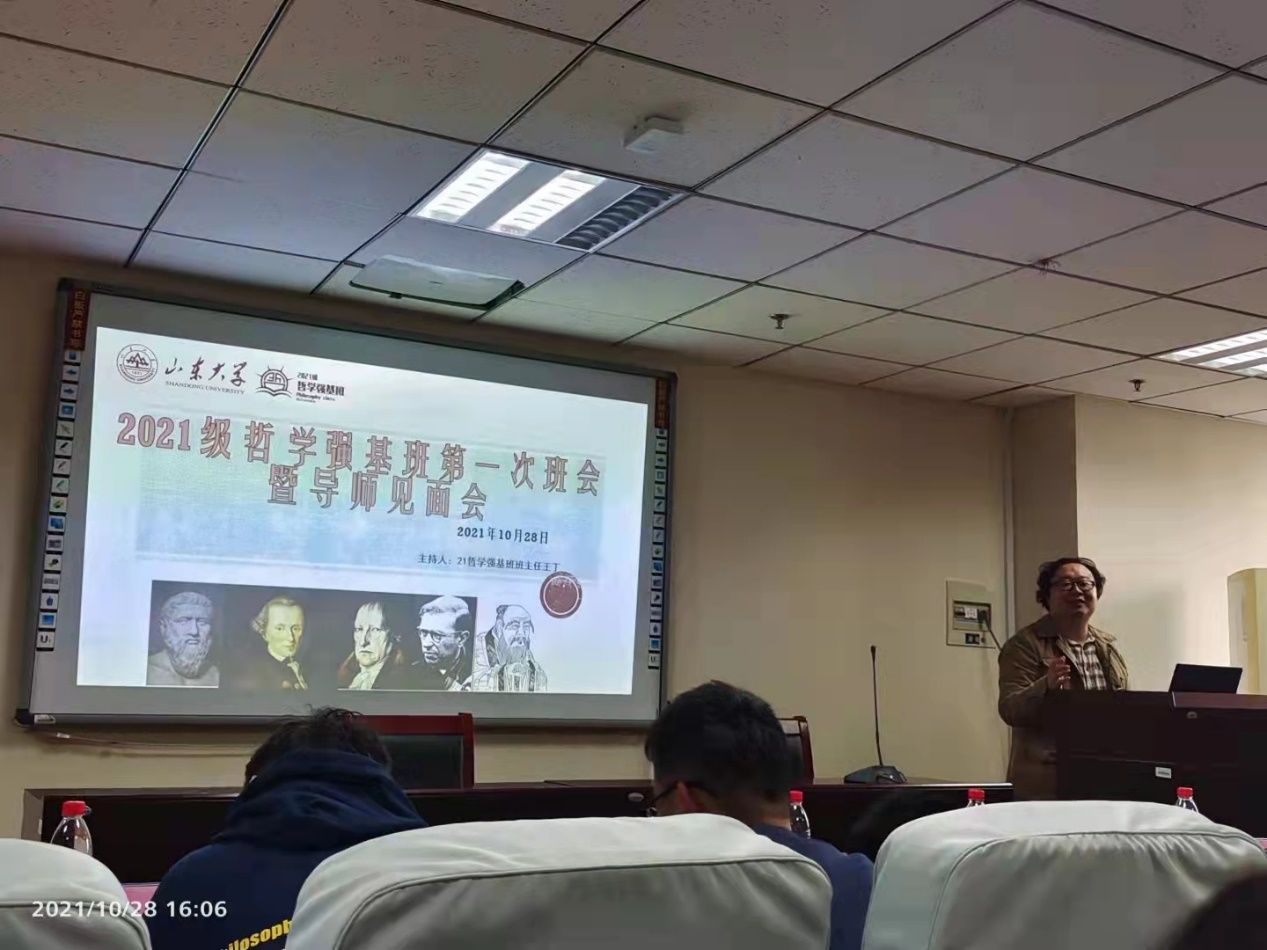 2021级哲学强基班开展学业导师推介会,冯波介绍了强基计划的基本培养模式,学业导师设置的必要性及相关政策。吴童立、单提平、梁乐睿、马士彪、徐超、李海涛分别为同学们介绍了各教研室的基本情况,各位老师的研究方向,使同学们对哲学各二级学科和山东大学哲学的学科特点有了一定的了解,。各位老师和同学们进行了互动交流,解答了同学们关于培养计划、专业学习等方面的问题,让同学们对哲学与宗教学的各个研究方向,对自己的学业规划有了更清晰的认识和把握。2021级哲学强基班班主任王丁主持了推介会。