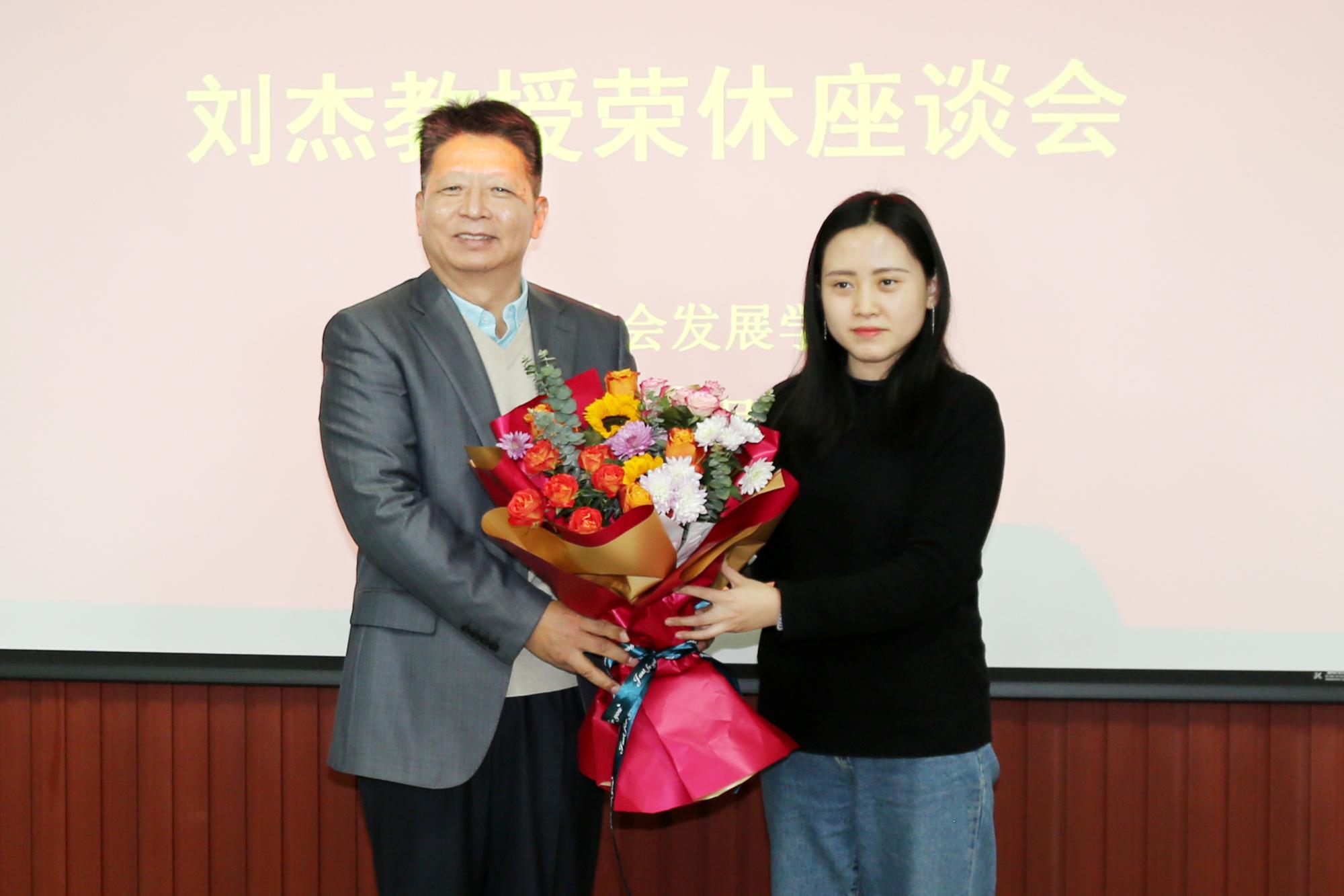 刘森林代表学院致辞,回顾了刘杰教授四十年的从教和科研之路,始终坚持孜孜以求、推陈出新,取得了令人瞩目的成绩。特别是在担任哲社学院院长期间,在加强学科建设、学缘结构多元化、高层次人才引进、国际化视野拓展等方面带领学院取得突出的成绩。对刘杰教授的学术品格和敬业精神表示敬意,同时祝刘杰教授身体健康、生活愉快,今后继续在学术领域发挥显著的影响力和融合力。随后,刘森林代表学院向刘杰教授赠送荣休纪念章;师生代表为刘杰教授送上鲜花。