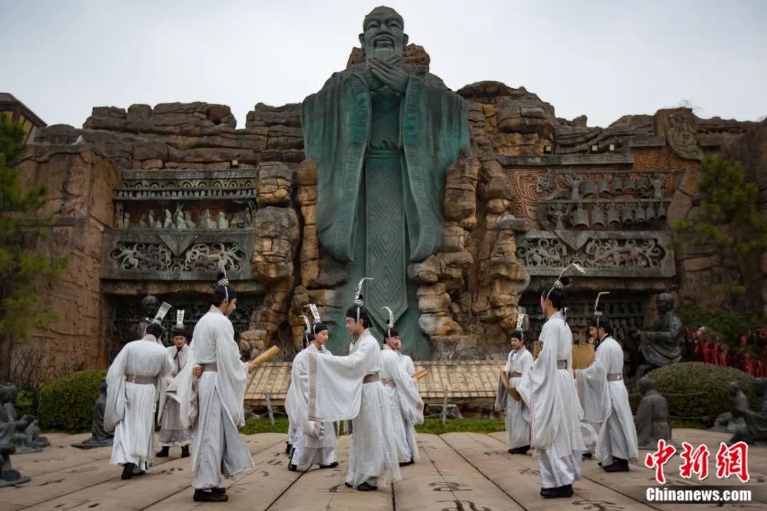 一场生动再现中国古代春秋时期孔子授课盛景的“礼乐古风·礼拜大儒”在常州淹城春秋乐园内上演。