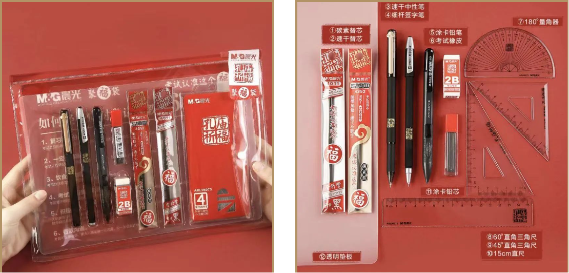 礼包内含黑色中性笔、涂卡笔、橡皮、涂卡铅芯、黑色水笔笔芯等考试必备文具。