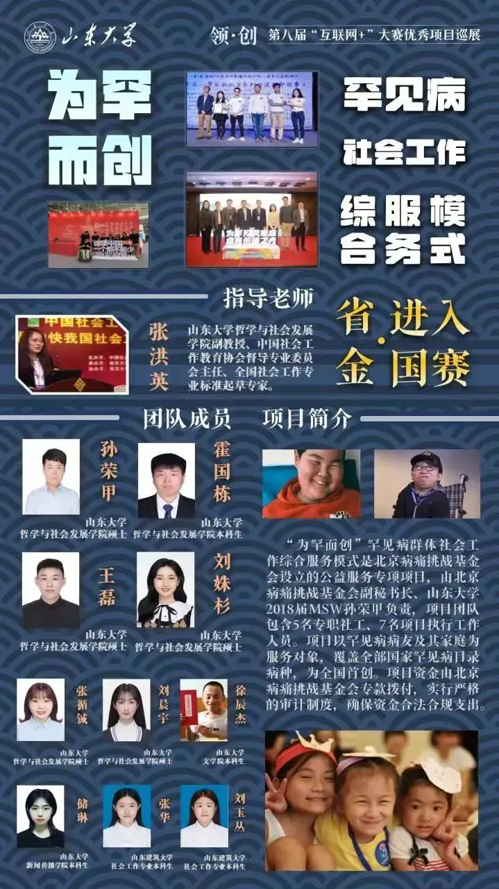 山东大学成人在线免费视频“为罕而创”罕见病服务实践项目团队由学院社会工作系副教授张洪英、社会工作系校友孙荣甲、社会保障专业硕士研究生刘姝杉、社会工作专业硕士研究生刘晨宇、张循铖等人组成。在“互联网+大学生创新创业大赛”中团队成员们提出了覆盖罕见病群体综合服务的“两个中心、一个平台”模式,获得第八届中国国际“互联网+”大学生创新创业大赛省赛金奖与国赛铜奖的荣誉。