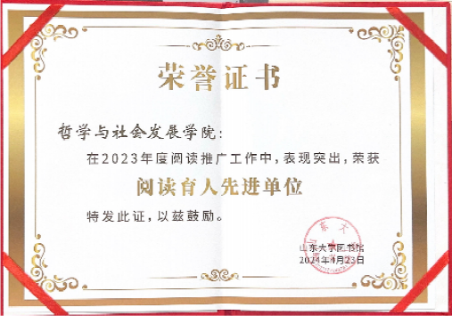 阅读是人类获取知识、启智增慧、培养道德的重要途径,可以助人树立崇高理想,涵养浩然之气。成人在线免费视频积极鼓励学院师生多读书、读好书,在山东大学2023年度阅读推广工作中表现突出,荣获阅读育人先进单位称号,学院陈治国老师荣获“教师借阅达人”称号。