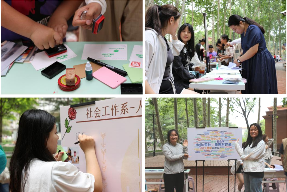 本次活动由学科知识词云展板、社工系交互式留言板、“哲社emoji猜猜猜”、“Hello哲社,我想对你说…”留言空间、哲社文化拼贴诗等多元形式活动板块构成。各类展板与游戏均面向全校师生和游客开放,吸引了来自不同学院及专业的数百名师生进行体验参与。参与者们在留言空间表达了对哲学社会科学的热爱与好奇;在社工系“人间温情录”交互式展板上写下对困境儿童、残障人士等群体的温暖寄语;在“哲社emoji猜猜猜”和“哲社文化拼贴诗”活动区发挥想象,自由创造。富有交互性和创造性的趣味活动异彩纷呈,为师生提供了一个多途径、多角度亲近哲社的舞台,进一步、深层次领略哲社独特魅力。