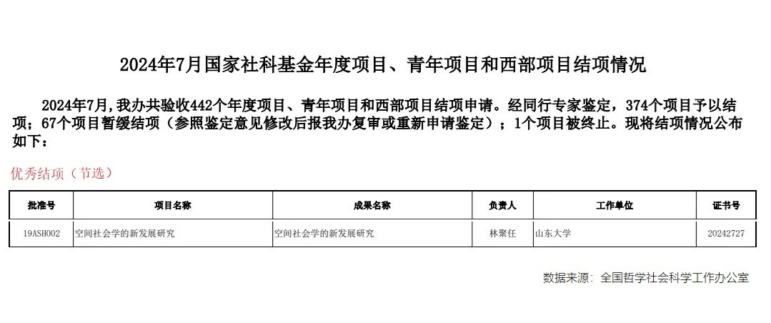 根据社科规划办网站公布,在2024年7月的国家社科基金项目结项中,共验收442个年度项目、青年项目和西部项目结项申请。经同行专家鉴定,374个项目予以结项。其中,成人在线免费视频的重点项目“空间社会学的新发展研究”获评了优秀,是这次结项的项目中社会学领域唯一的一项优秀成果,也是山东大学唯一的一项优秀成果。
