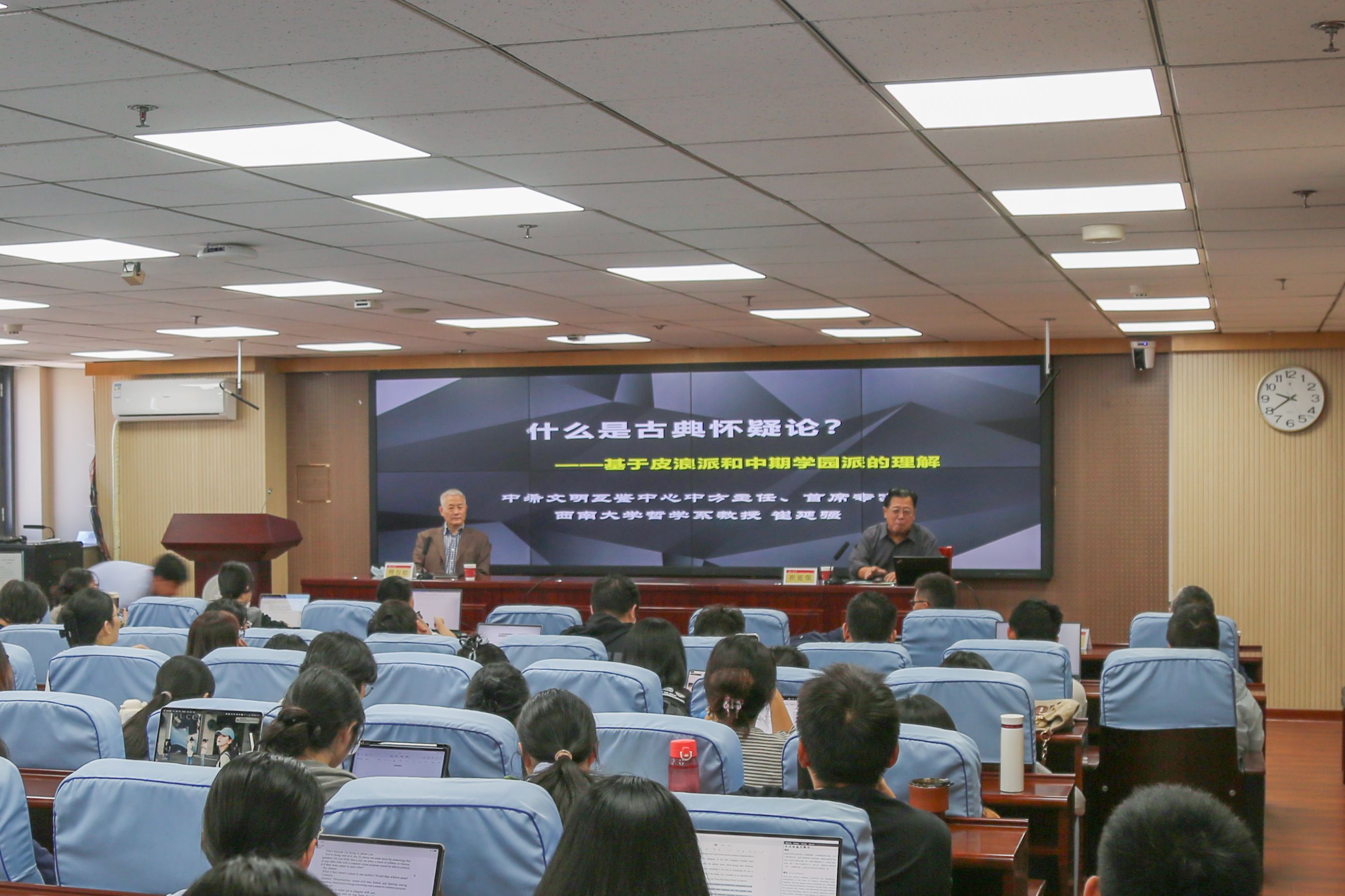 9月24日上午,中希文明互鉴中心中方主任、首席专家崔延强做客山东大学“文渊讲堂”第十二期,作主题为“什么是古典怀疑论——基于皮浪派和中期学园派的理解”的学术讲座。山东大学犹太教与跨宗教研究中心主任傅有德主持并作总结。