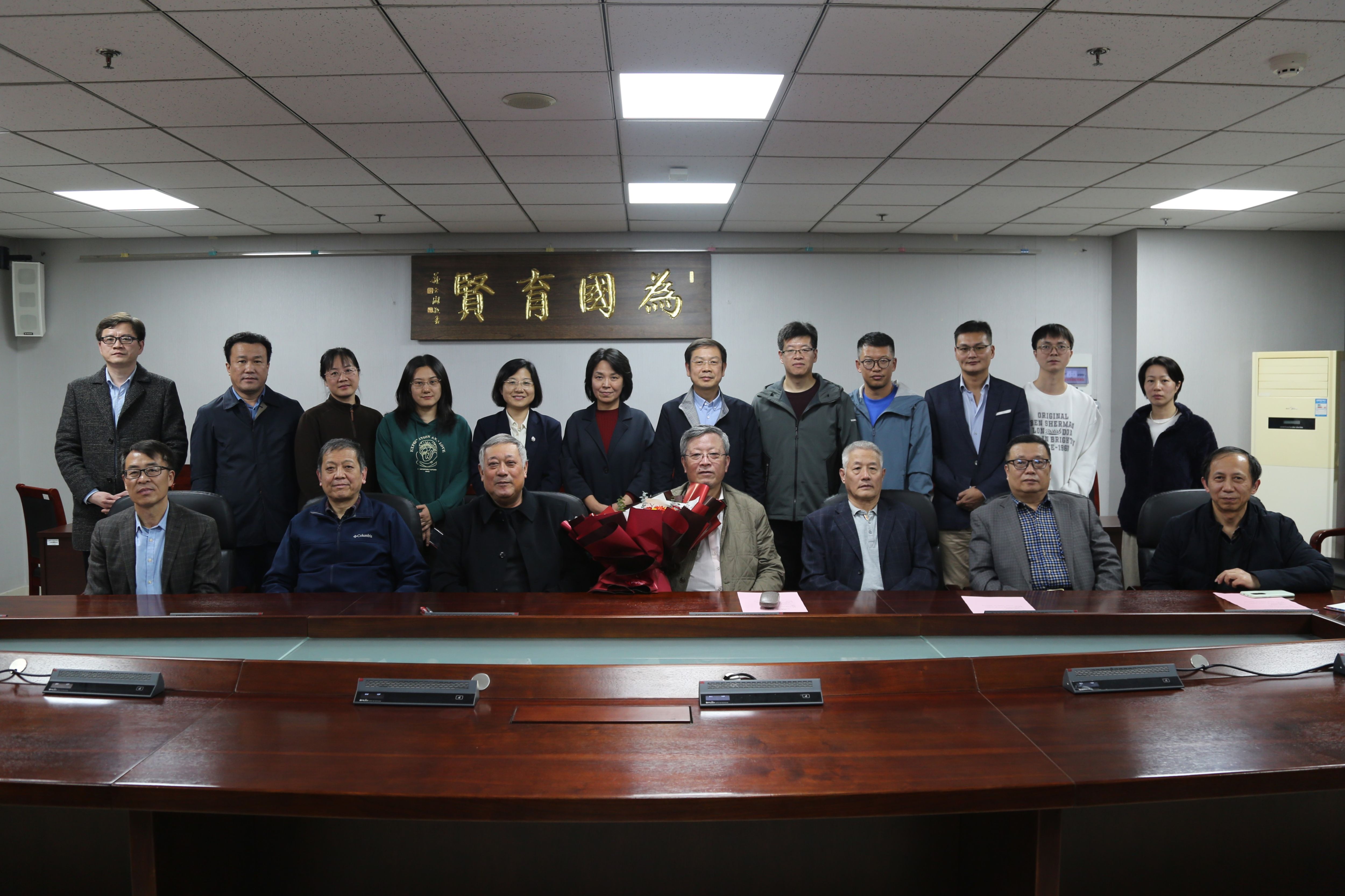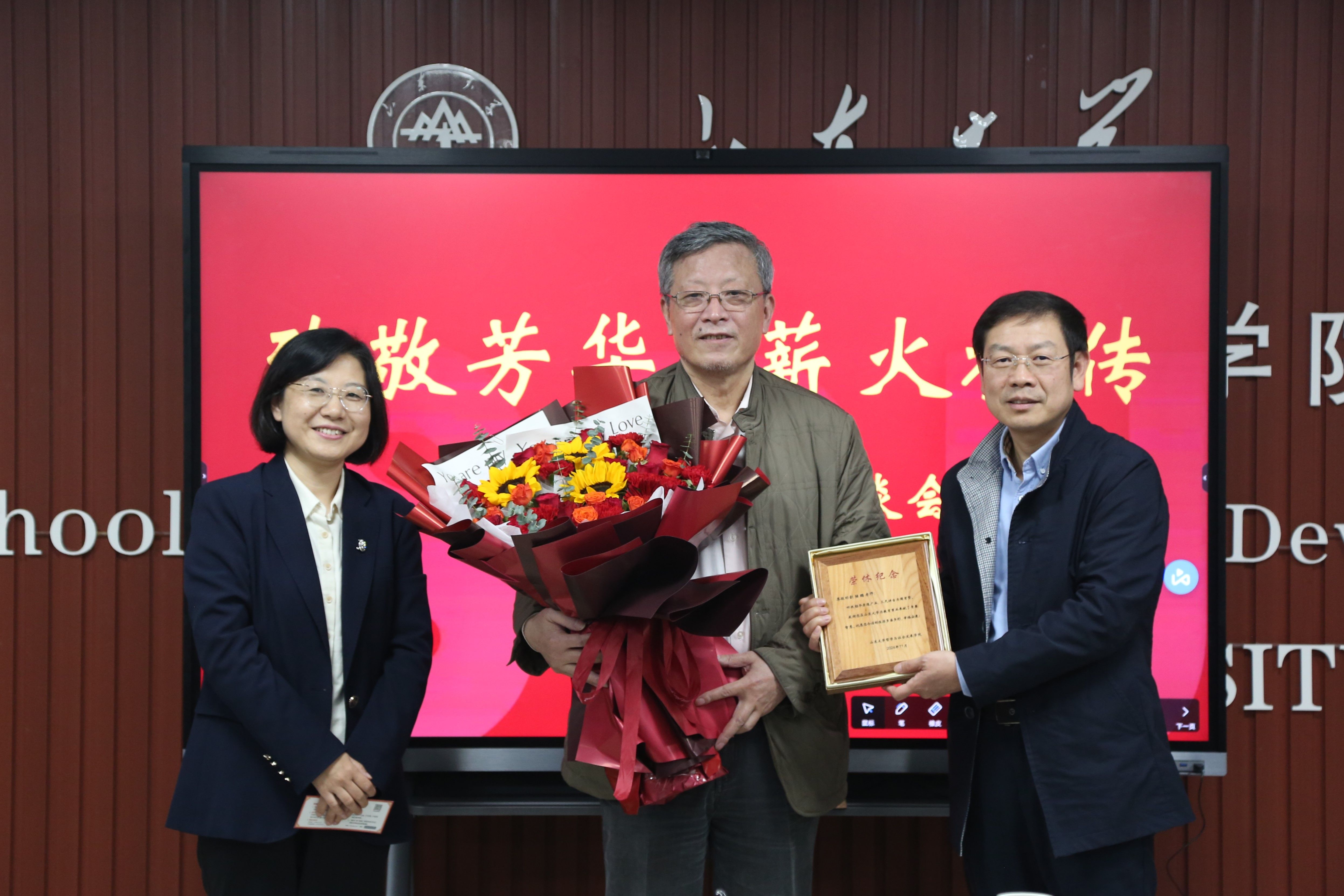 座谈交流后,学院班子及教师代表为刘陆鹏老师敬献了鲜花,全体参会人员合影留念,荣休仪式在温馨和谐的氛围中圆满落幕。整个活动,不仅体现了学院对教职员工的尊重、爱护与关怀,也彰显了中华民族尊师重教的优良传统,激励着新时代教师和学子见贤思齐,传承优秀品格,接续为学校事业高质量发展和教育强国建设贡献自己的青春与力量。