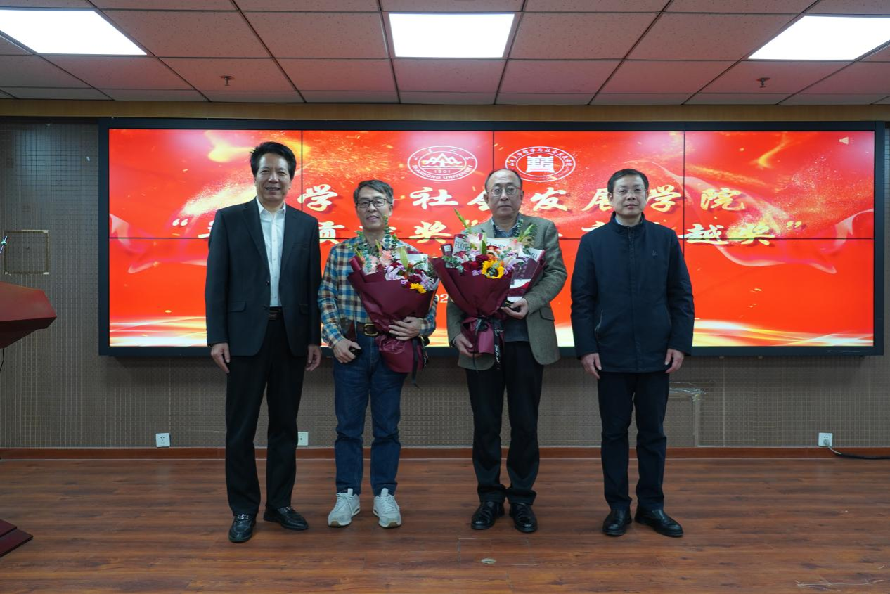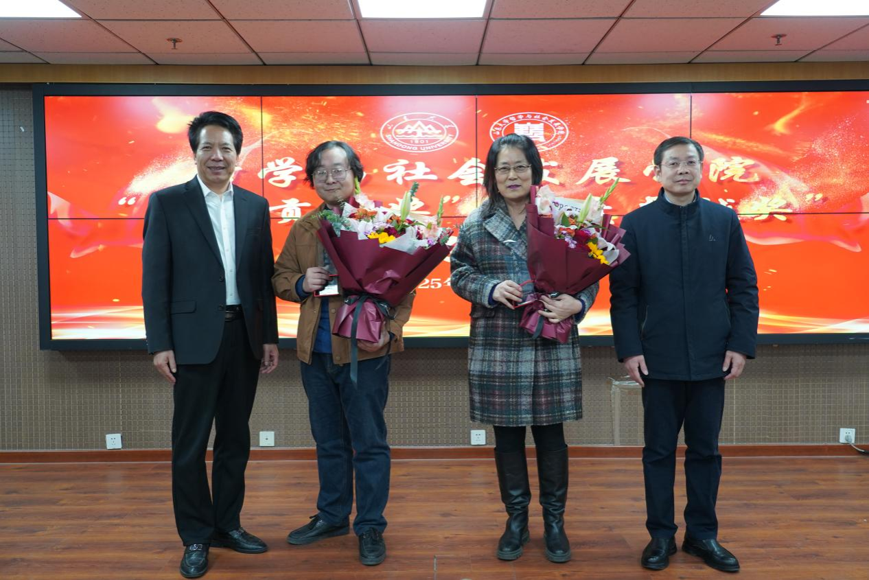 曹现强为本年度“卓越奖”获得者刘森林、郭武和“贡献奖”获得者张洪英、王丁颁奖。“卓越奖”旨在表彰本职工作之外为学院赢得殊荣或提升影响力的教工,“贡献奖”旨在表彰自身岗位职责之外为学院公共事务倾心付出在某些方面作出较大贡献的教工。