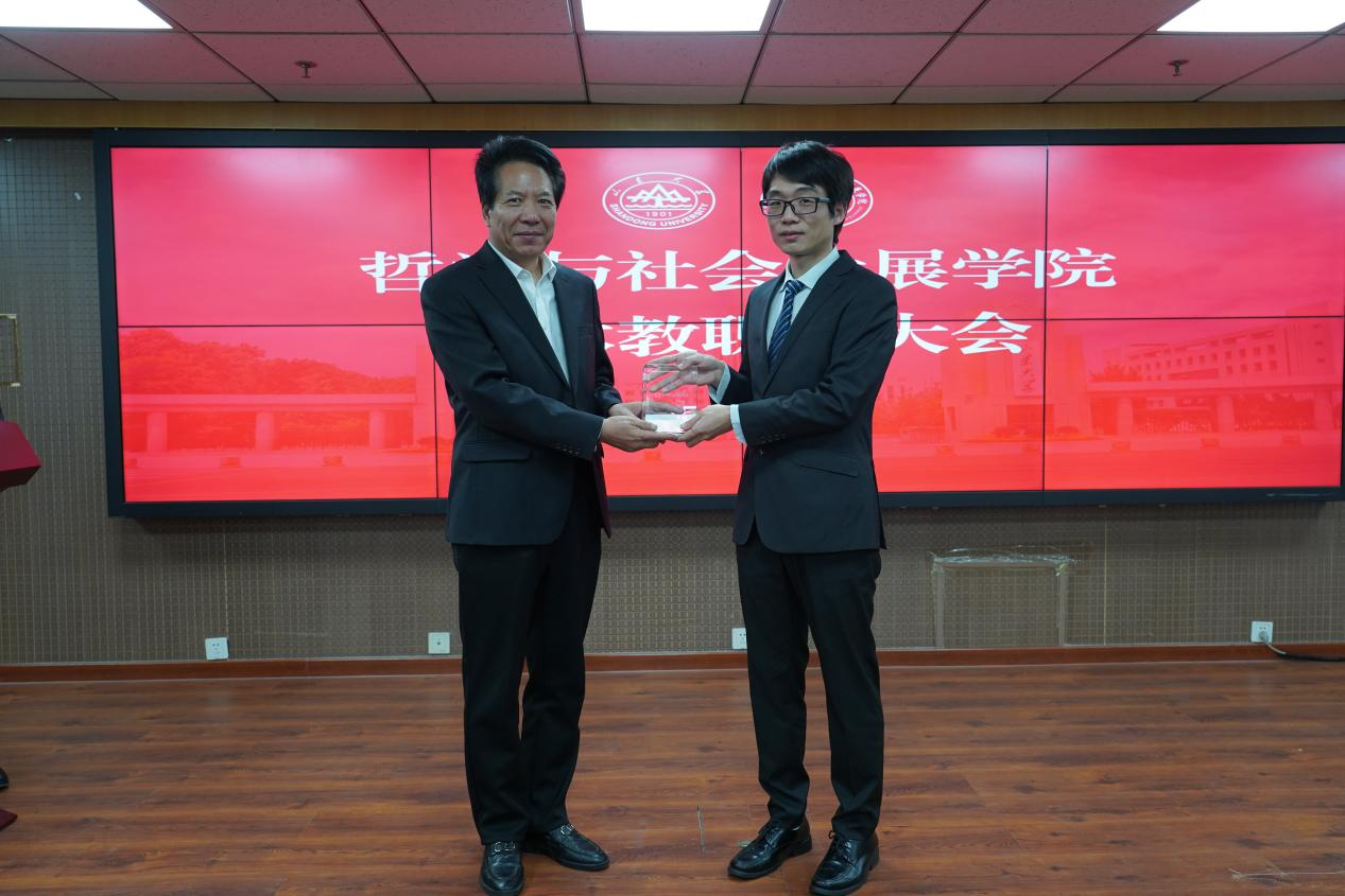 随后,曹现强为新入职的马哲教研室李世杰助理研究员颁发入职名牌,欢迎新教师加入学院大家庭。