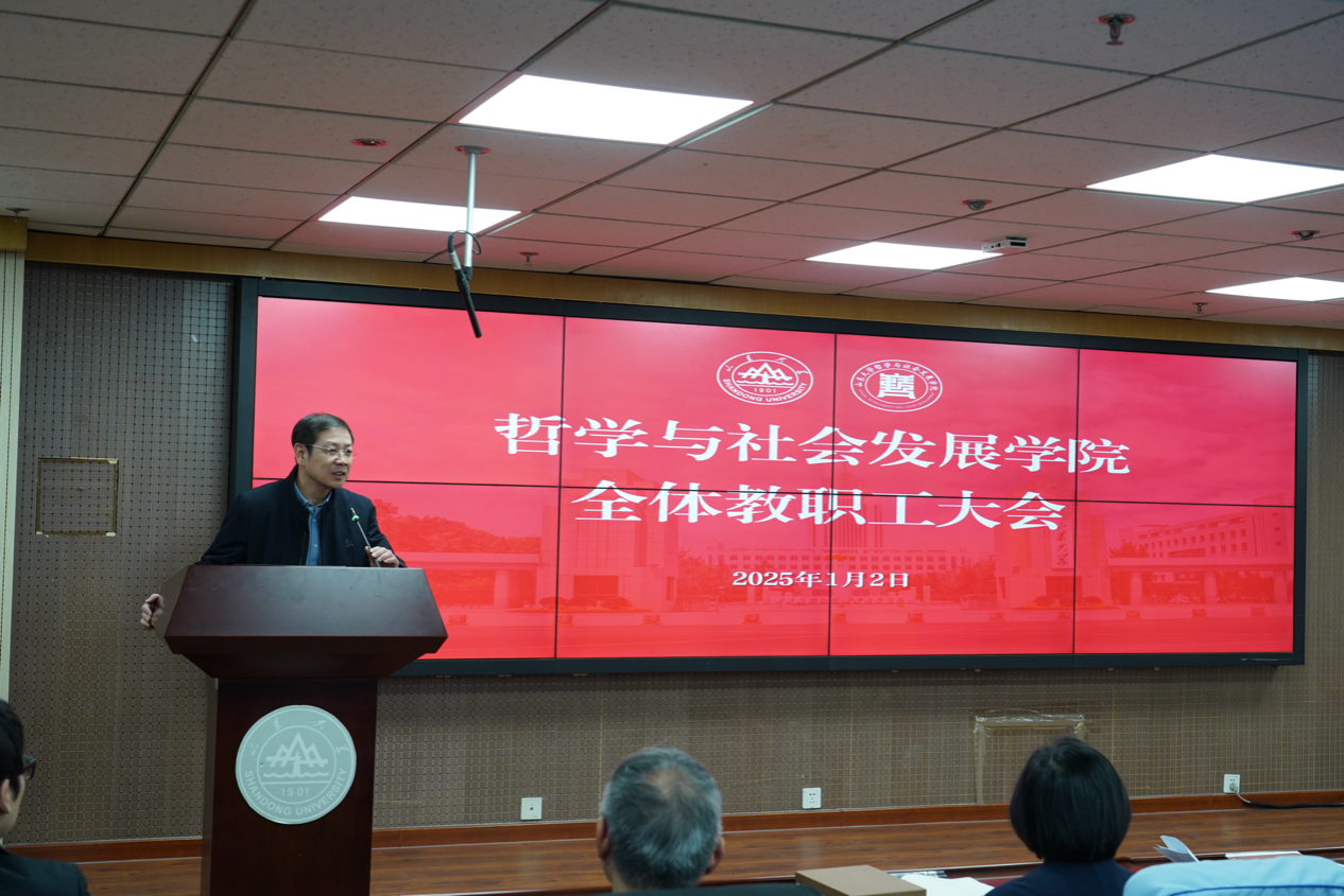 曹现强作总结讲话。他指出,2024年是哲社学院事业的丰收之年,在全院师生团结一心共同努力下,各个方面都取得了令人瞩目的成绩,发展态势和环境氛围持续向上向好,希望全院上下乘势而上、再接再厉,统筹谋划今后一个时期尤其是2025年工作。他强调,全体教工要研究分析把握高等教育发展大势,将自身发展融入教育强国建设中,努力为中国哲学社会科学自主知识体系建构贡献力量。要统筹平衡好自由探索与有组织科研之间的关系,有规划有步骤地组织开展面向国家重大需求和社会发展迫切需要的创新研究,力争产出更多标志性成果。要紧跟时代要求,扬优势补短板,密切关注并积极参与数智化、人工智能等新兴领域,推进学科交叉融合创新,提升立德树人成效。要深化学院治理改革,通过办事方式、运作机制、组织方式等方面的协作创新,提升管理服务整体效能,助力学院事业高质量发展。