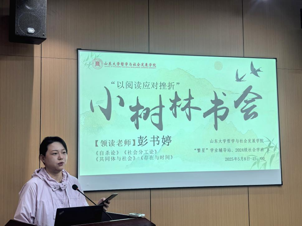 为深入学习贯彻习近平总书记关于全民阅读的重要指示精神,深化"学在山大,快乐成长"育人理念,2025年5月8日,山东大学成人在线免费视频“繁星”学业辅导站于知新楼A116组织开展了小树林书会活动。此次活动由2024级社会学一班承办,人类学系彭书婷老师以“以阅读应对挫折”为题进行分享,学院社会学专业本科生参加了学习。党委副书记翁祥栋、辅导员封莹共同参与。