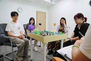 师生还与智善心理医院的院长、资深专家张敬悬教授进行座谈交流。同学们踊跃提问,就心理健康服务的实务操作与专业发展路径与张教授深入交流。随后,同学们分组体验了沙盘游戏、专业心理测试、艺术治疗绘画、生物反馈测试以及动物辅助治疗等项目。