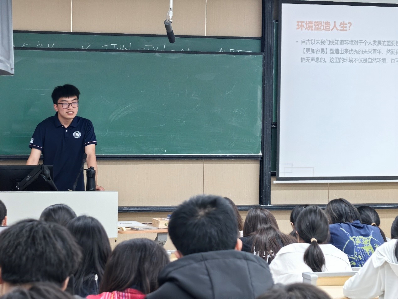 随后,24级哲学拔尖班心理委员郑一健从生活环境对个人心理的影响、用情绪观解析人情绪的本质、情绪惯性与理性界限、宽容原则与平等沟通四个角度,围绕情绪管理的方法和技巧展开阐述。在互动环节,同学们积极发言,于讨论中更加深入地了解到情绪背后的心理学机制,提升情绪调节能力。