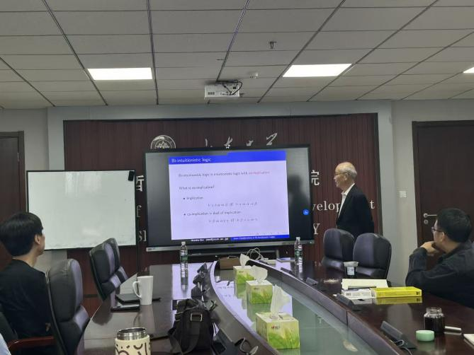 2025 年 9 月 22 日,“望岳——海外名师论坛”第14期在知新楼 A1618 举行。此次论坛邀请到日本北陆先端科学技术大学院大学小野宽晰教授做题为 “Some considerations of bi-intuitionistic logics” 的学术报告,报告由哲社学院梁飞老师主持。讲座前,梁飞老师先简要介绍了小野(Ono)教授的工作 —— 尤其是在“子结构逻辑”上成果的重要意义,且小野教授是少数在学术界获得广泛国际认可的亚洲逻辑学家,随后对小野教授到来表示欢迎。