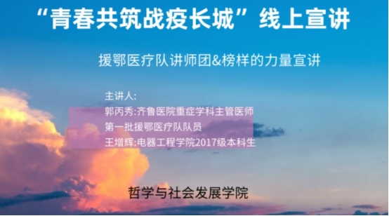 为深入贯彻落实习近平总书记关于抗击新冠肺炎疫情的重要指示精神,增强青年学生在抗疫工作中的责任感和使命感,引导青年学生做好职业生涯规划,哲社学院于5月30日—31日开展了“青春共筑战疫长城”线上宣讲活动。