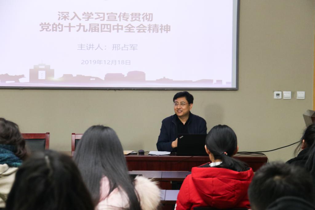 12月18日下午,山东大学校长助理、人文社科研究院院长邢占军为哲社学院2017级社会学专业本科生讲授“深入宣传贯彻党的十九届四中全会精神”主题思政课,哲社学院党委书记郑倩参加并主持。