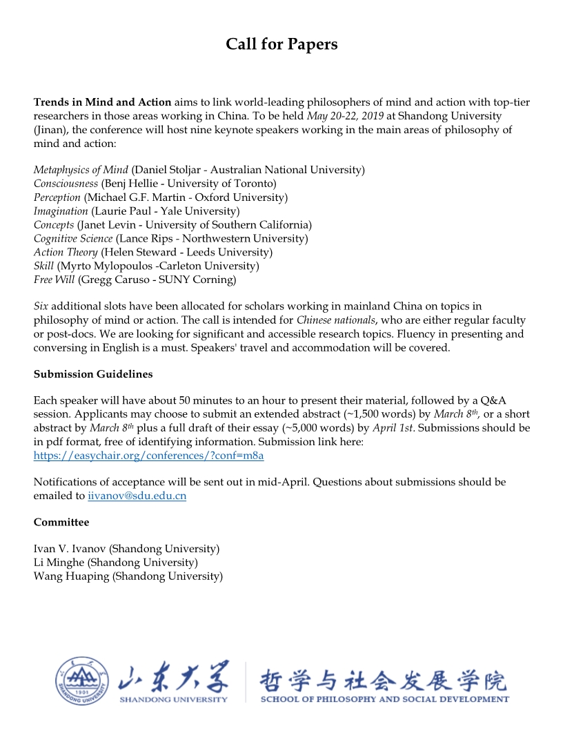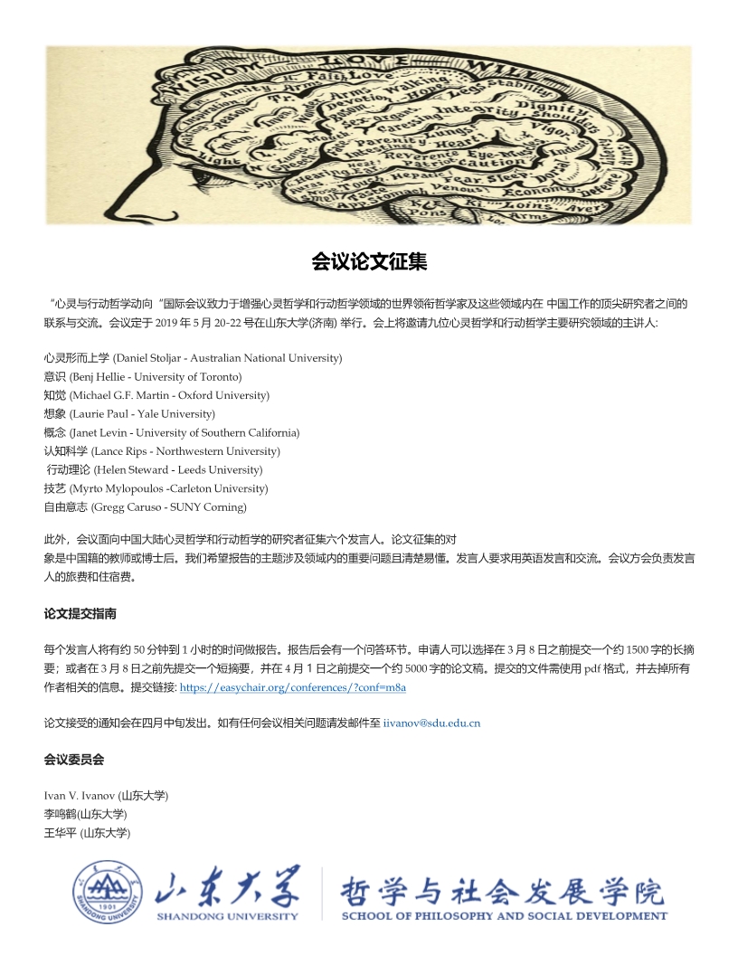 山东大学成人在线免费视频将于2019年5月20-22日举行”心灵与行动哲学动向“国际会议,在此征集六个会议报告人。此次会议旨在汇集心灵哲学与行动哲学主要领域的海外及国内一流学者的研究成果。除了国内的六个报告,会议还将有9名世界领衔学者的主题报告。诚邀大家申请参会。